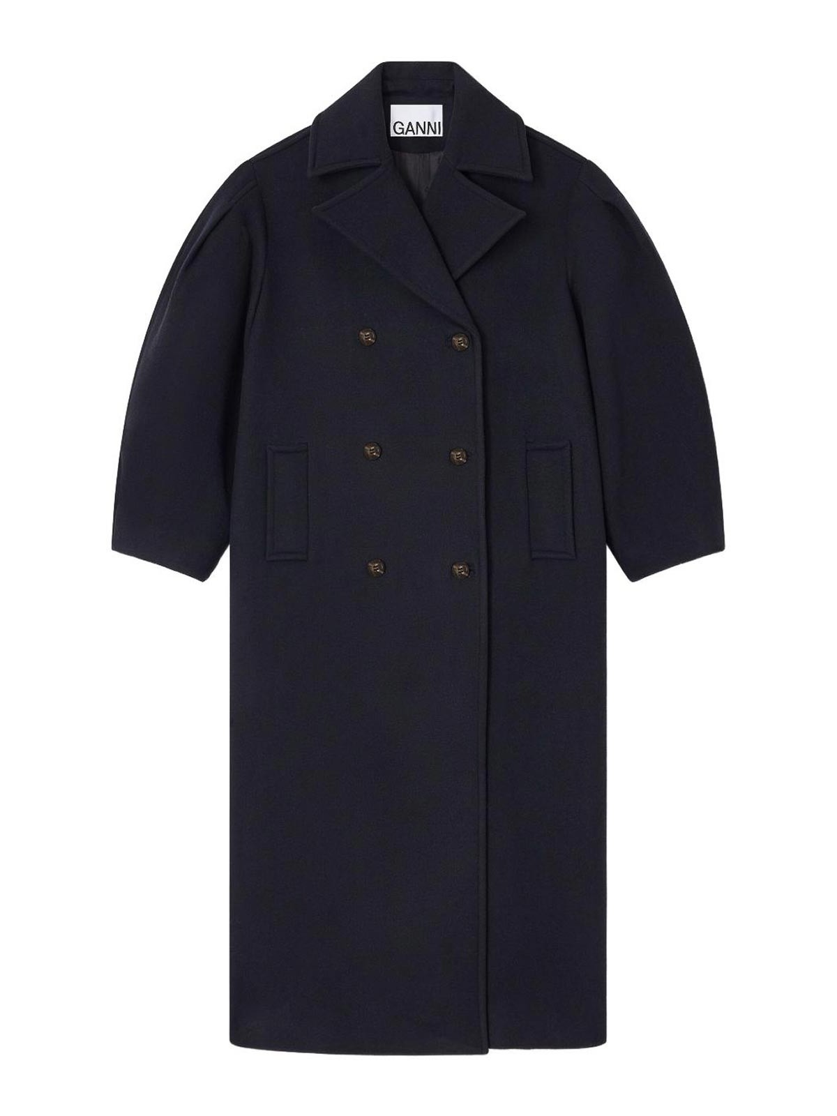 Manches ballon bleu marine, fermeture à double boutonnage, revers crantés, poches passepoilées boutonnées