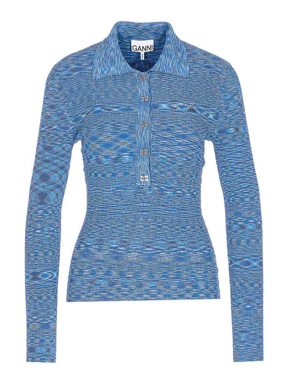Logo à col polo teinté bleu Ganni, boutons sur les manches longues, logo brodé sur le