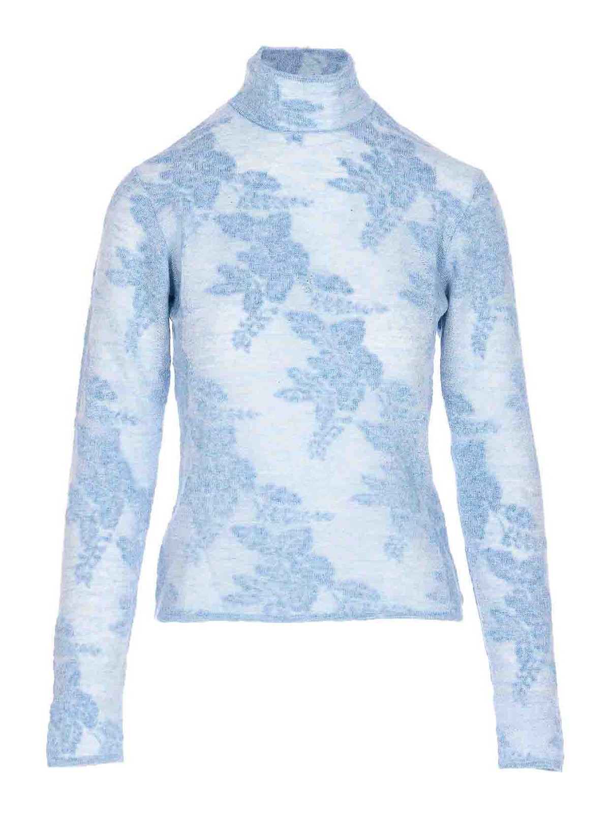 Pull Ganni bleu clair, col haut, boutons dans le dos, manches longues