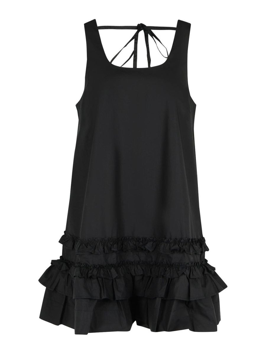 Col, design sans manches, naud au dos, ourlet bouclé.