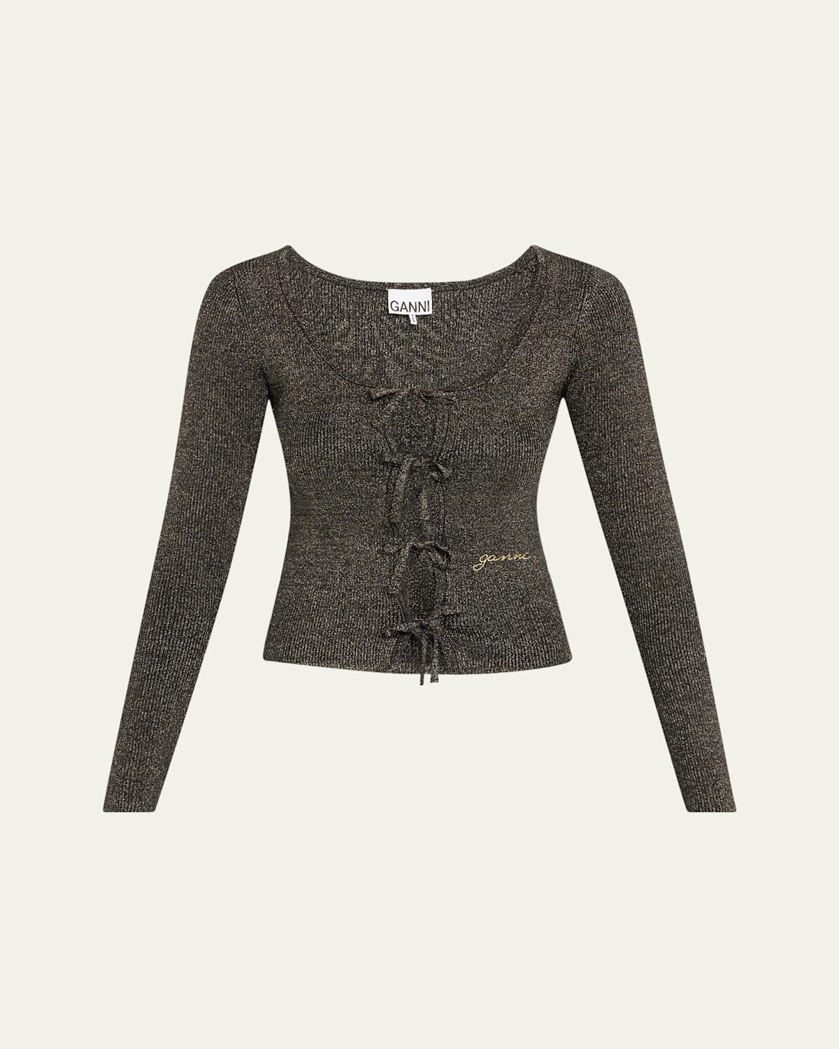 Ganni sparkly ribbedknit blouse featuring a selftie front Scoop neckline Long sleeves Cropped fit Hem sits at the hip Nylon/polyamide/organic cotton/wool Hand wash Imported