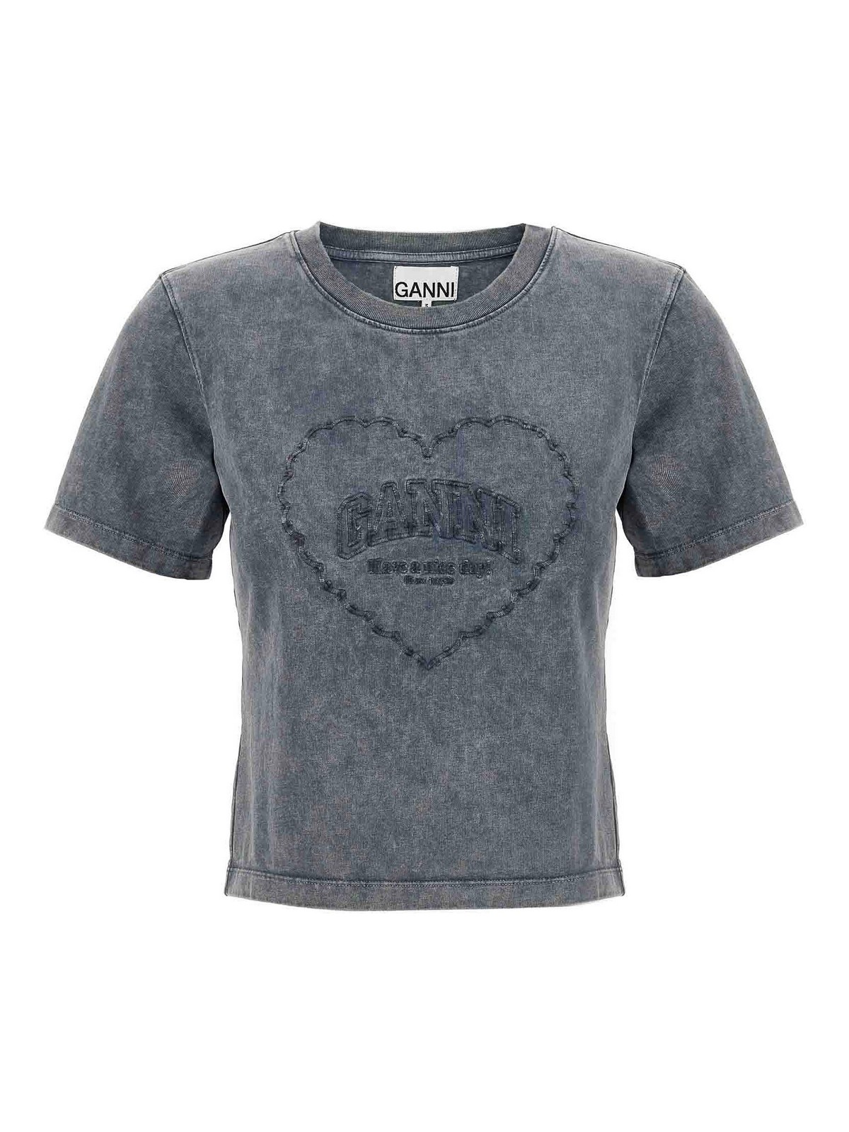 t-shirt gris en forme de caur délavé avec logo, col rond, manches courtes, durable, ce produit est fabriqué en