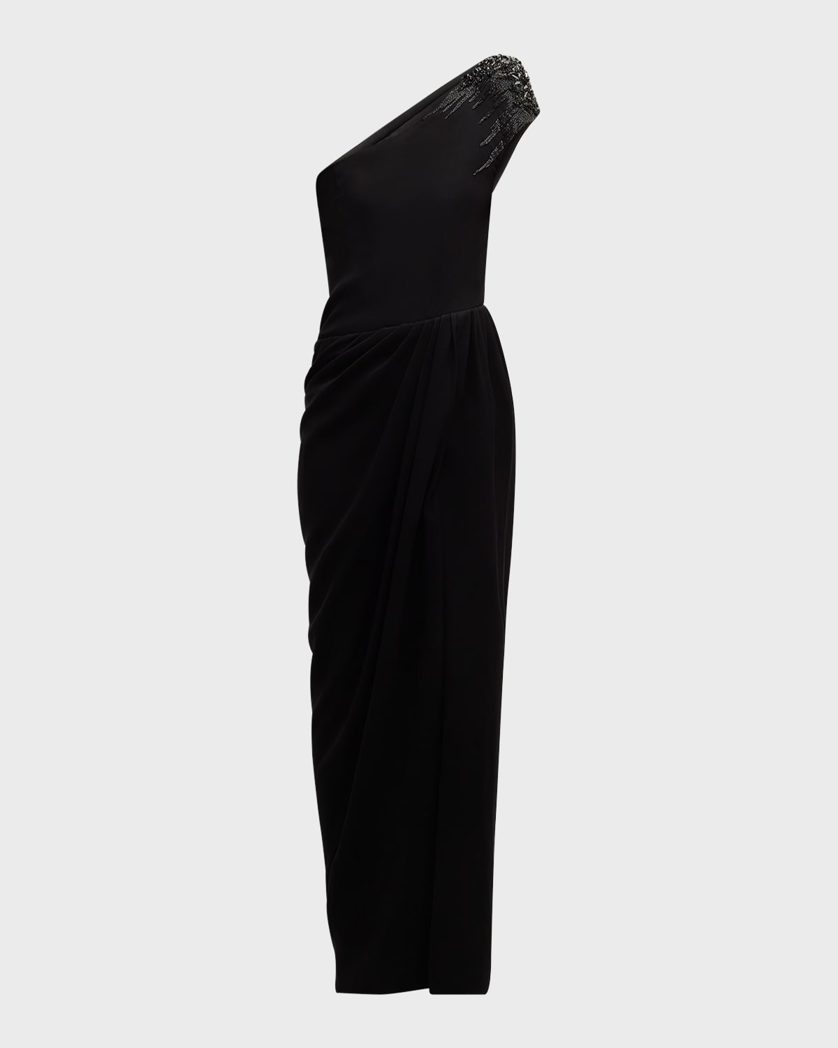 Gaurav Gupta structured gown features a padded shoulder with tonal bead and crystal embellishments Approx. 63"L from shoulder to hem Oneshoulder neckline Sleeveless Full length Column silhouette Hidden zip closure Polyester Dry clean Imported