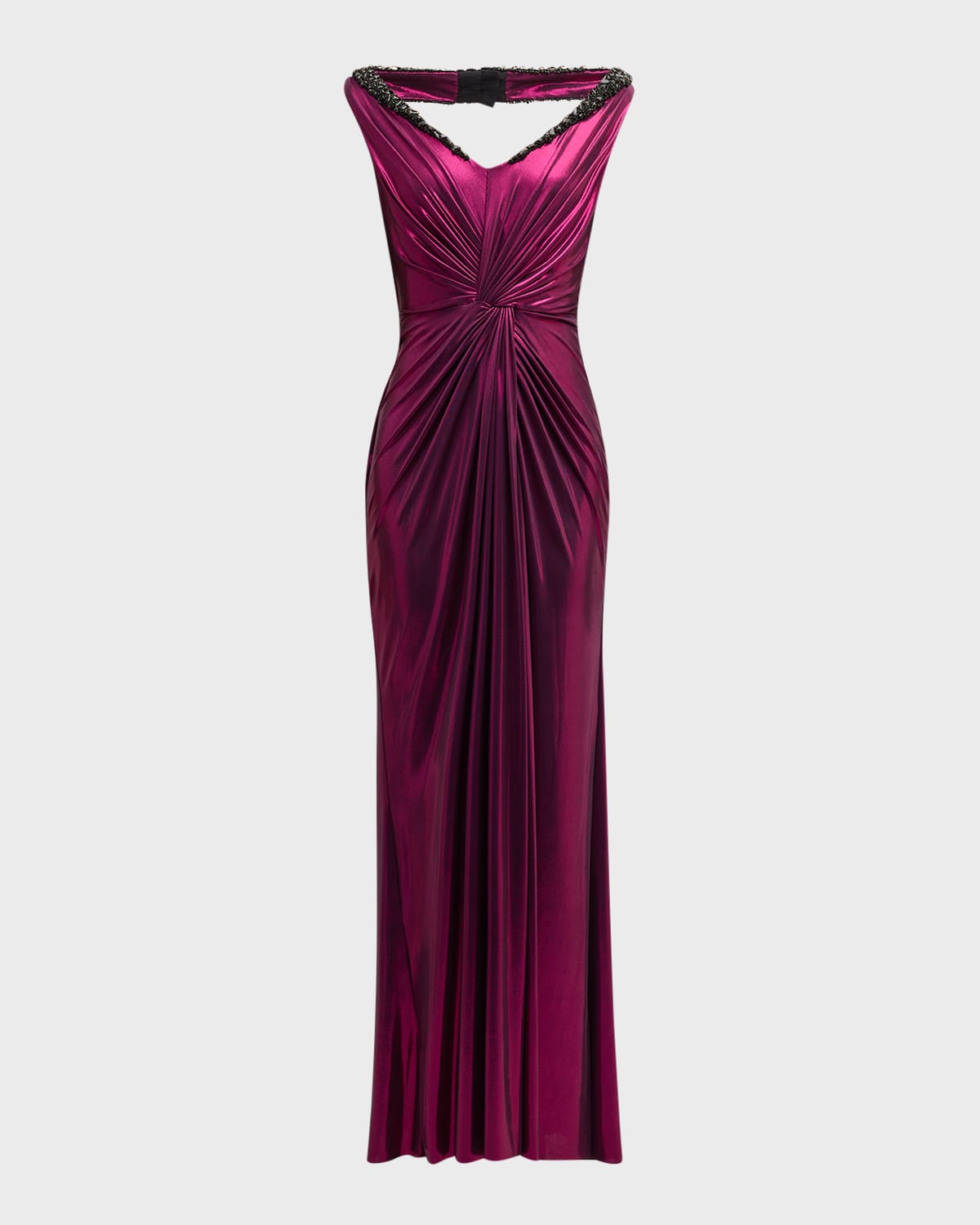 Gaurav Gupta gunmetal oil jersey gown featuring crystal embellishment, knotted waist, and a cowl draped open back Approx. 63"L from shoulder to hem Wide V neckline Sleeveless Aline silhouette Floor length Hidden closure Polyester/silk Dry clean Imported