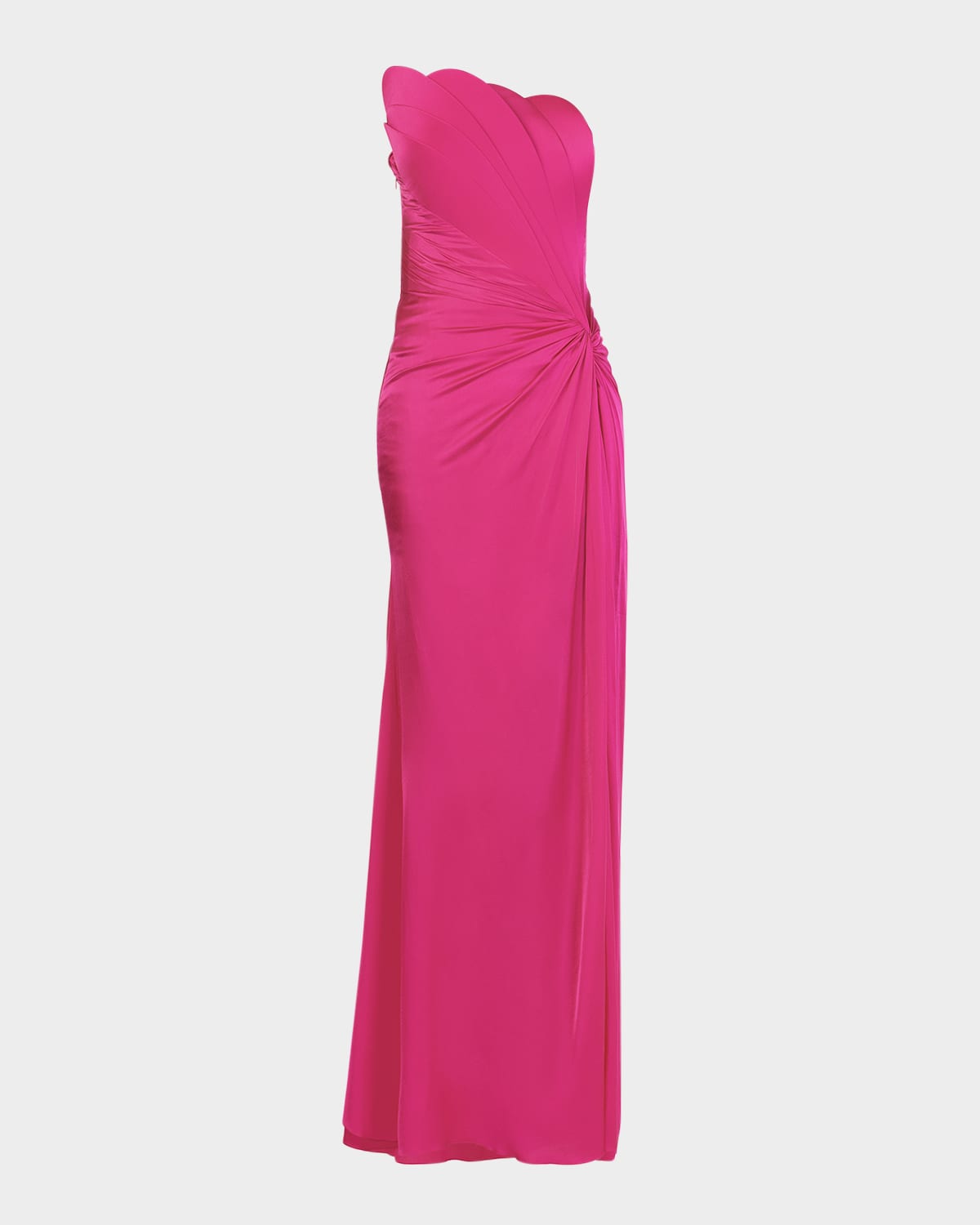 Gaurav Gupta "French Fuschia" gown features a cascading sculpted petal bodice with inner corsetry construction and twisted hip draping Approx. 63"L from shoulder to hem Strapless neckline Sleeveless Column silhouette Floor sweeping hem Thigh slit hem Side zip closure Silk/elastane Dry clean Imported