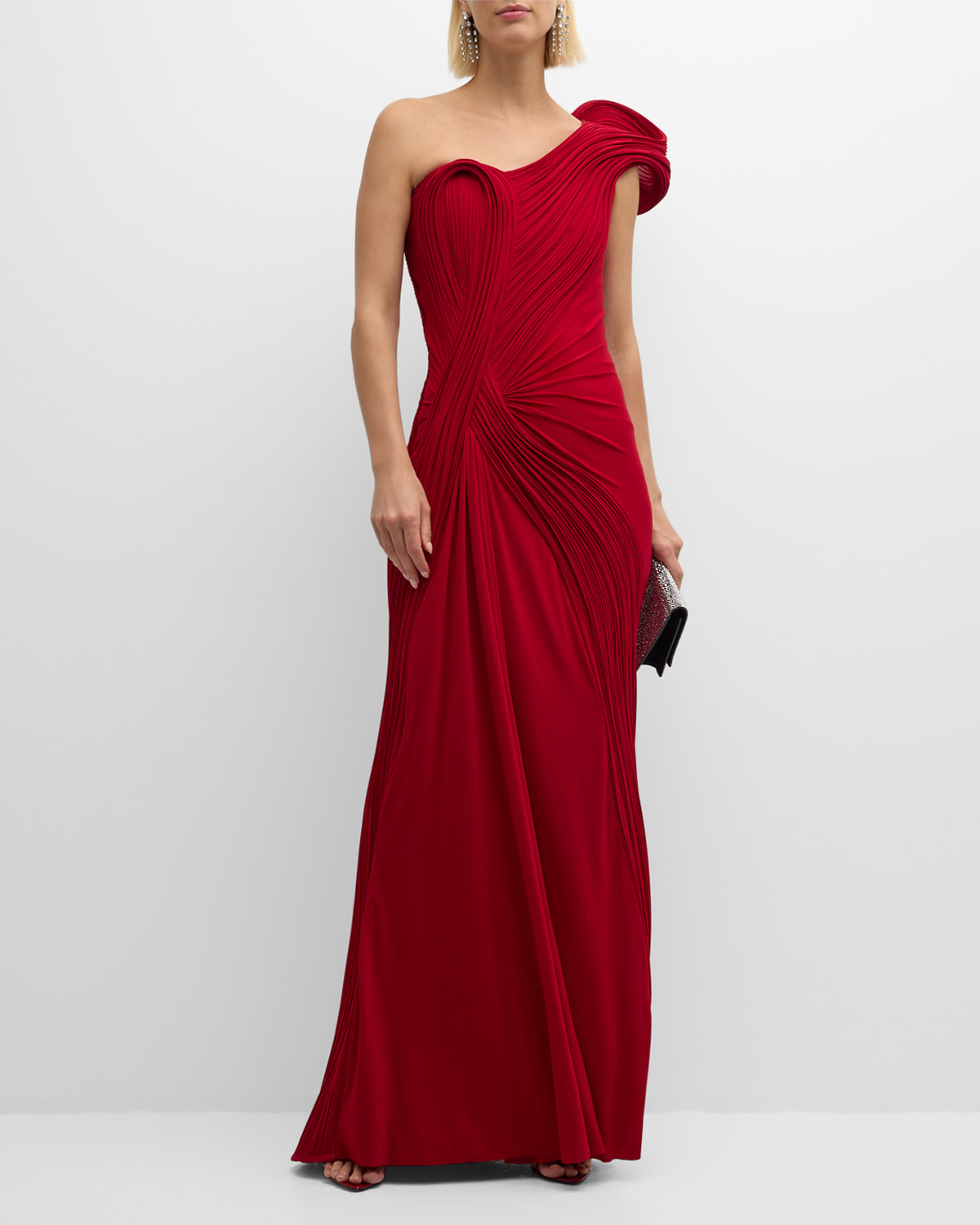 Metallic Jacquard One-Shoulder Side-Ruffle Gown