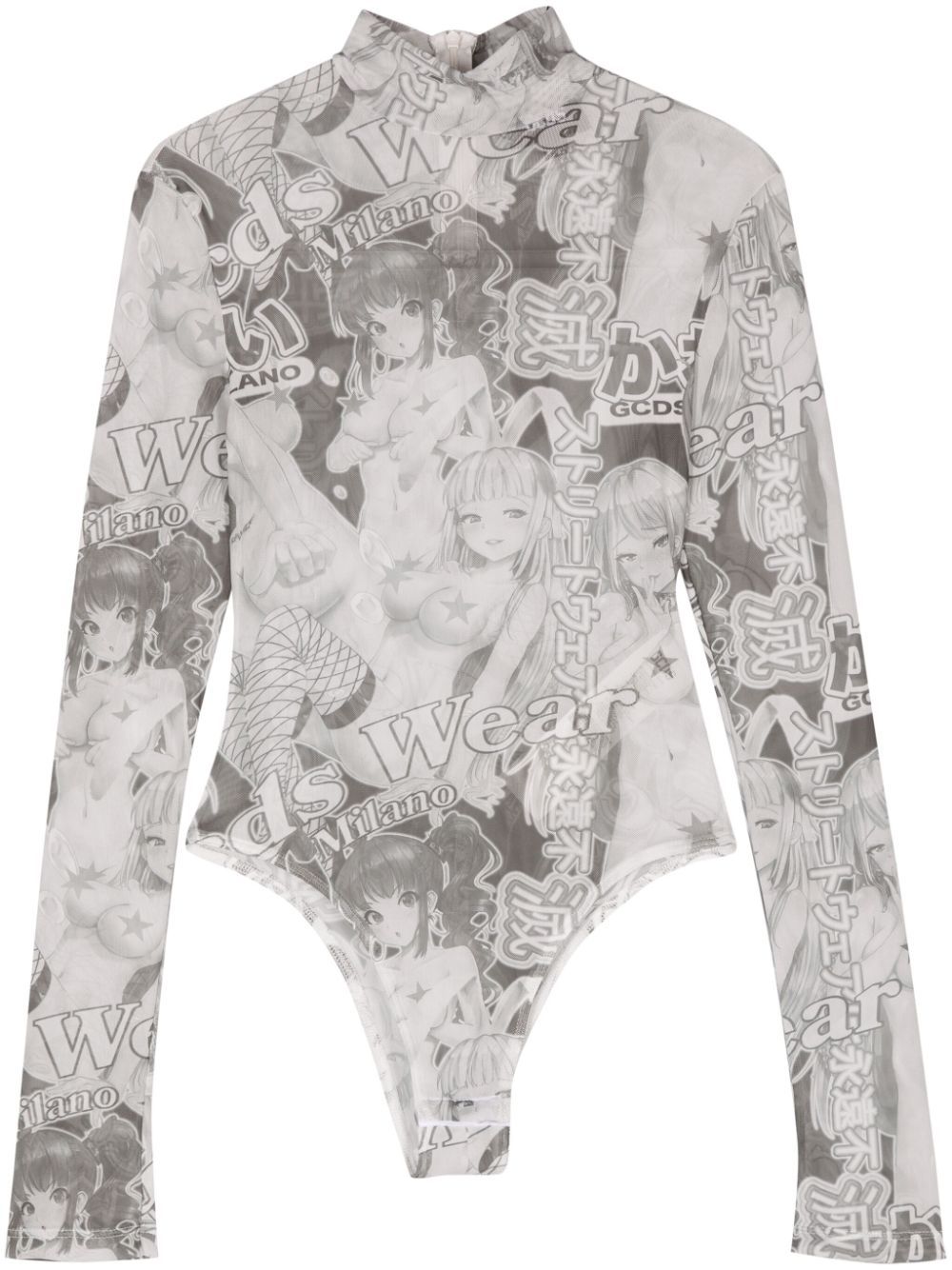 light grey/medium grey semi-sheer construction all-over graphic print mock neck long sleeves concealed rear zip fastening press-stud fastening