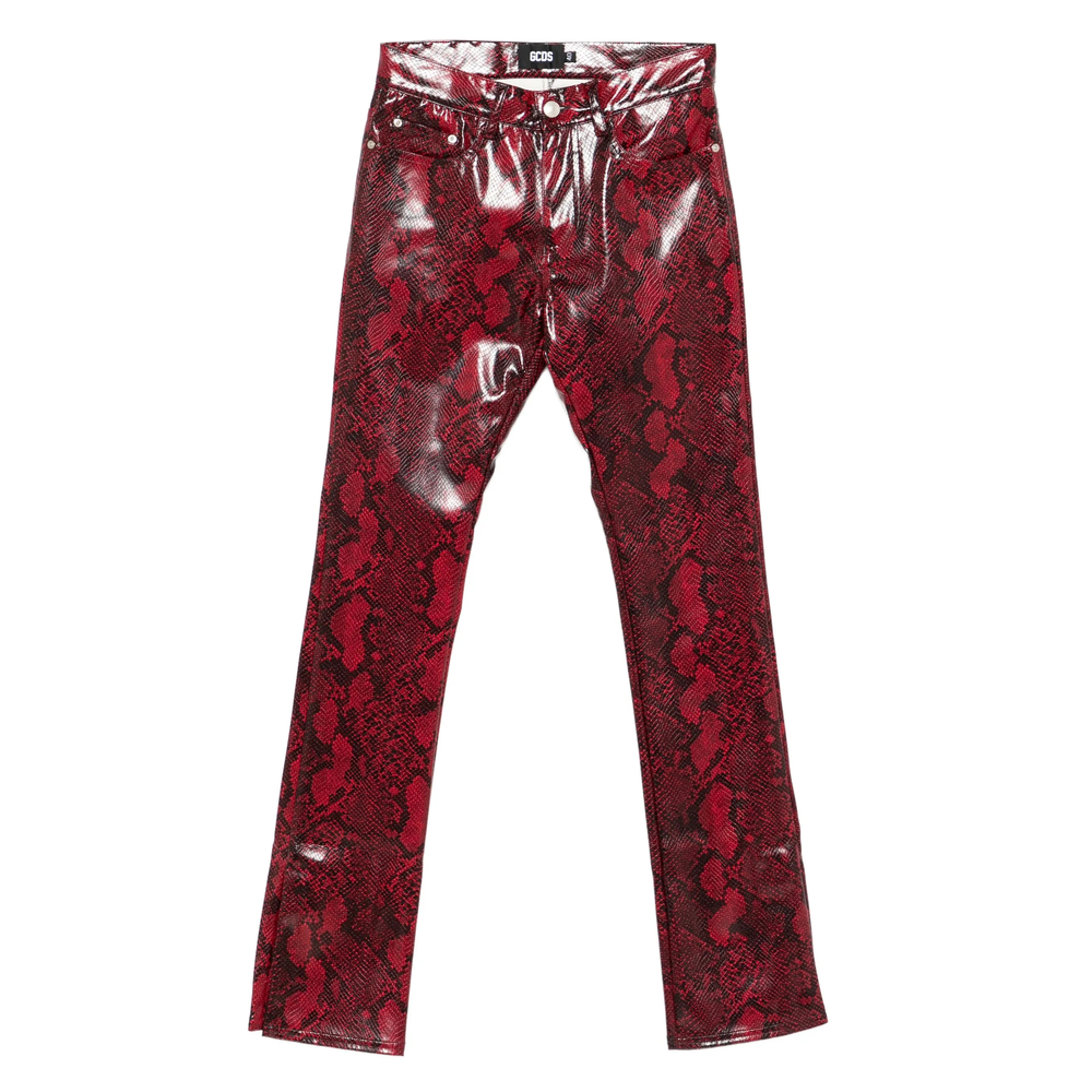 red snakeskin print high shine finish five pockets belt loops button fastening