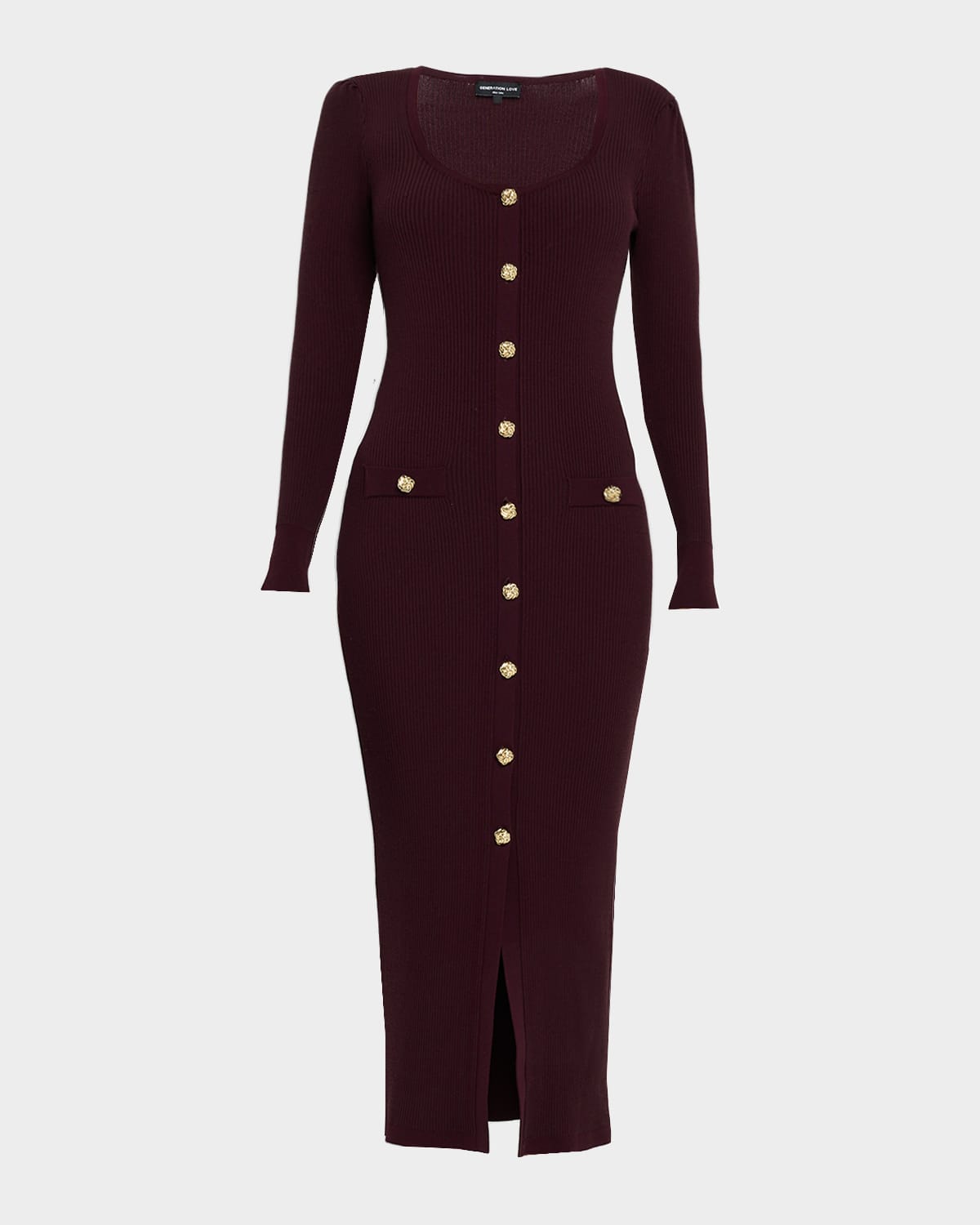 Crafted from a soft ribbed knit, the "Andolina" midi dress by Generation Love is finished with knotted goldtone buttons for a glamorous touch. Scoop neckline Long sleeves Welt pockets Figurehugging silhouette Hem falls below the knee Buttonfront Viscose/nylon/polyamide Dry clean Imported