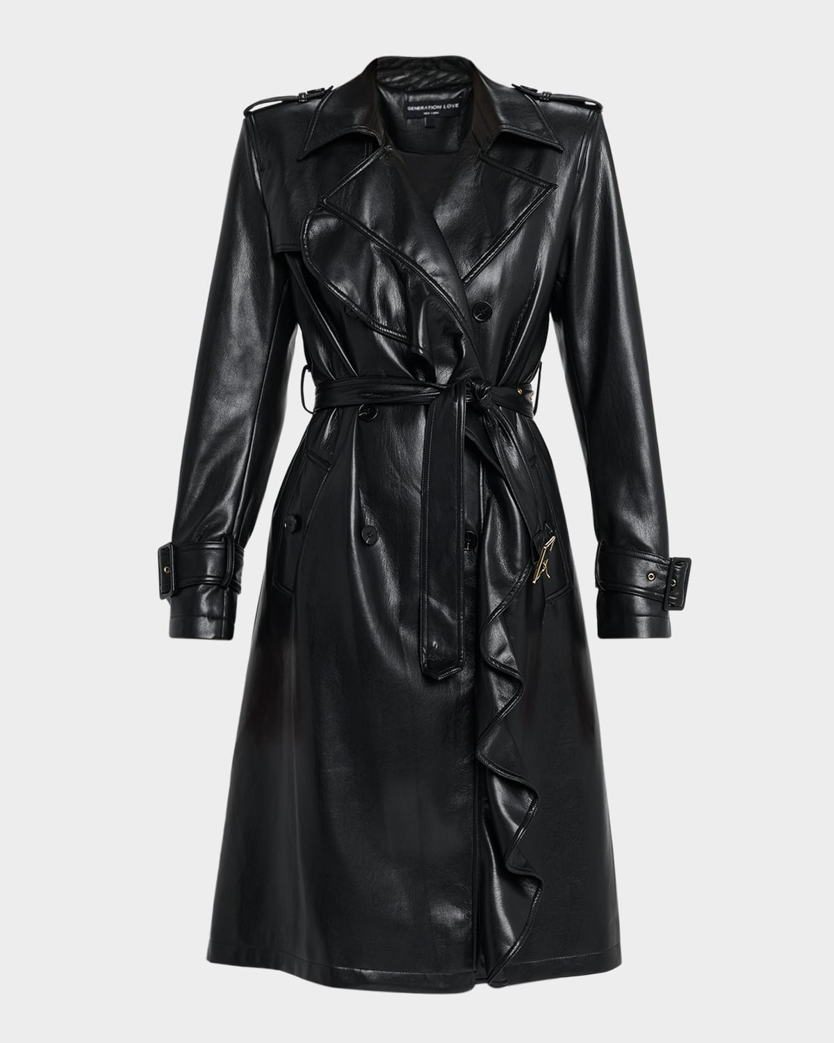 An update to your favorite trench in stylish vegan leather, the "Hearst" trench coat by Generation Love features ruffle trim for a feminine touch. Notched lapels Doublebreasted front Structured shoulders with epaulets Long sleeves with button cuffs Adjustable self belt Angled side pockets Classic fit Hem falls just below the knee Buttonfront Polyurethane/polyester Dry clean Imported
