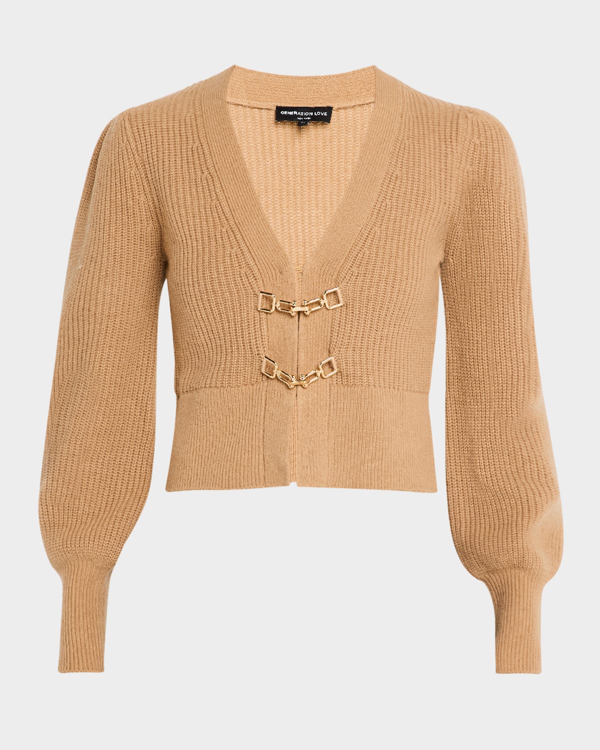Generation Love "Monse" intarsia knit cardigan featuring goldtone hardware V neckline Long bishop sleeves Fitted silhouette Hem sits at the hip Buckle closure Merino wool Unlined Dry clean Imported