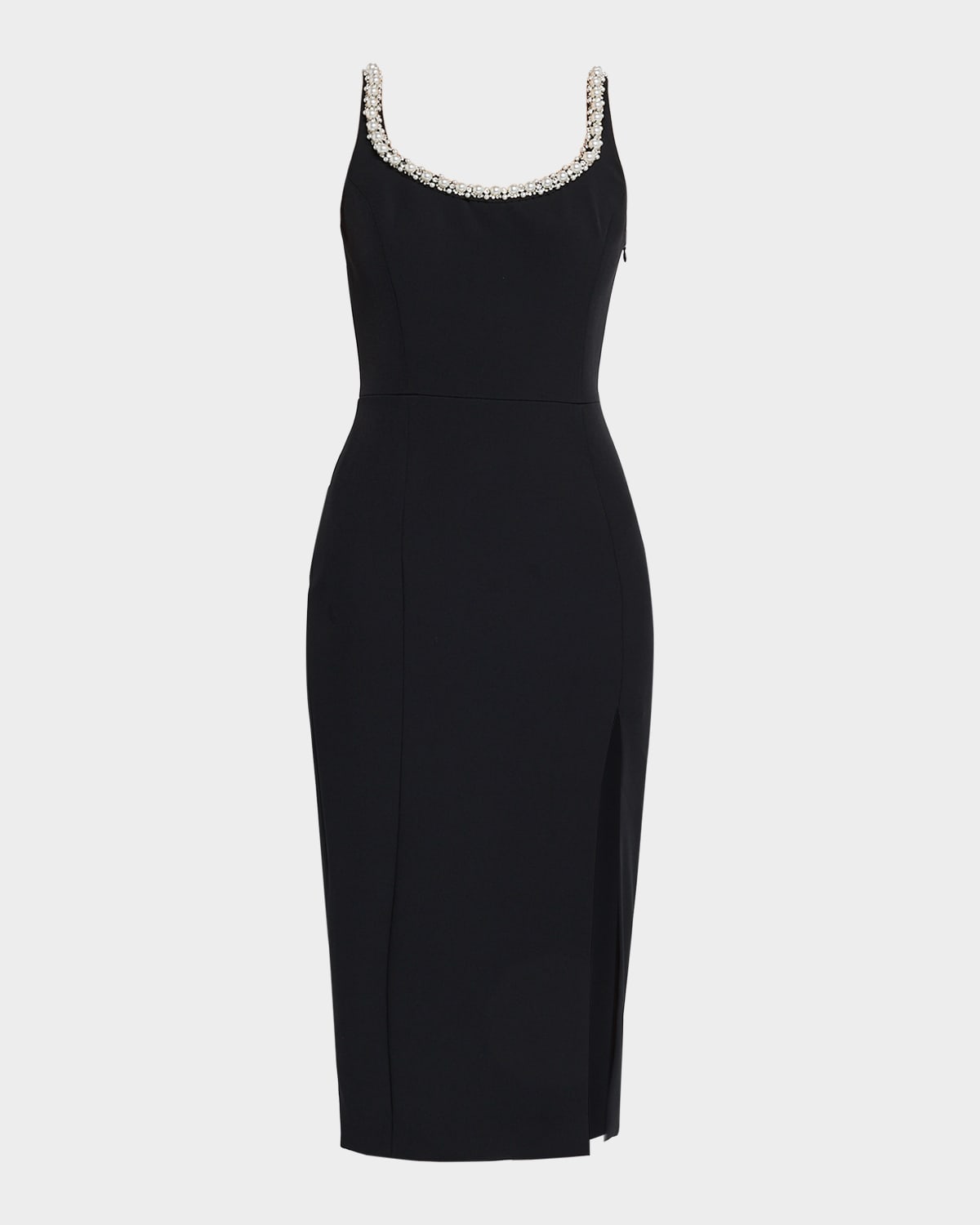 A sophisticated silhouette with a feminine touch, the "Prague" midi dress by Generation Love is finished with crystal and pearly trim. Scoop neckline Sleeveless Sheath silhouette Thighhigh slit Invisible side zip Polyester/elastane Hand wash, hang to dry Imported
