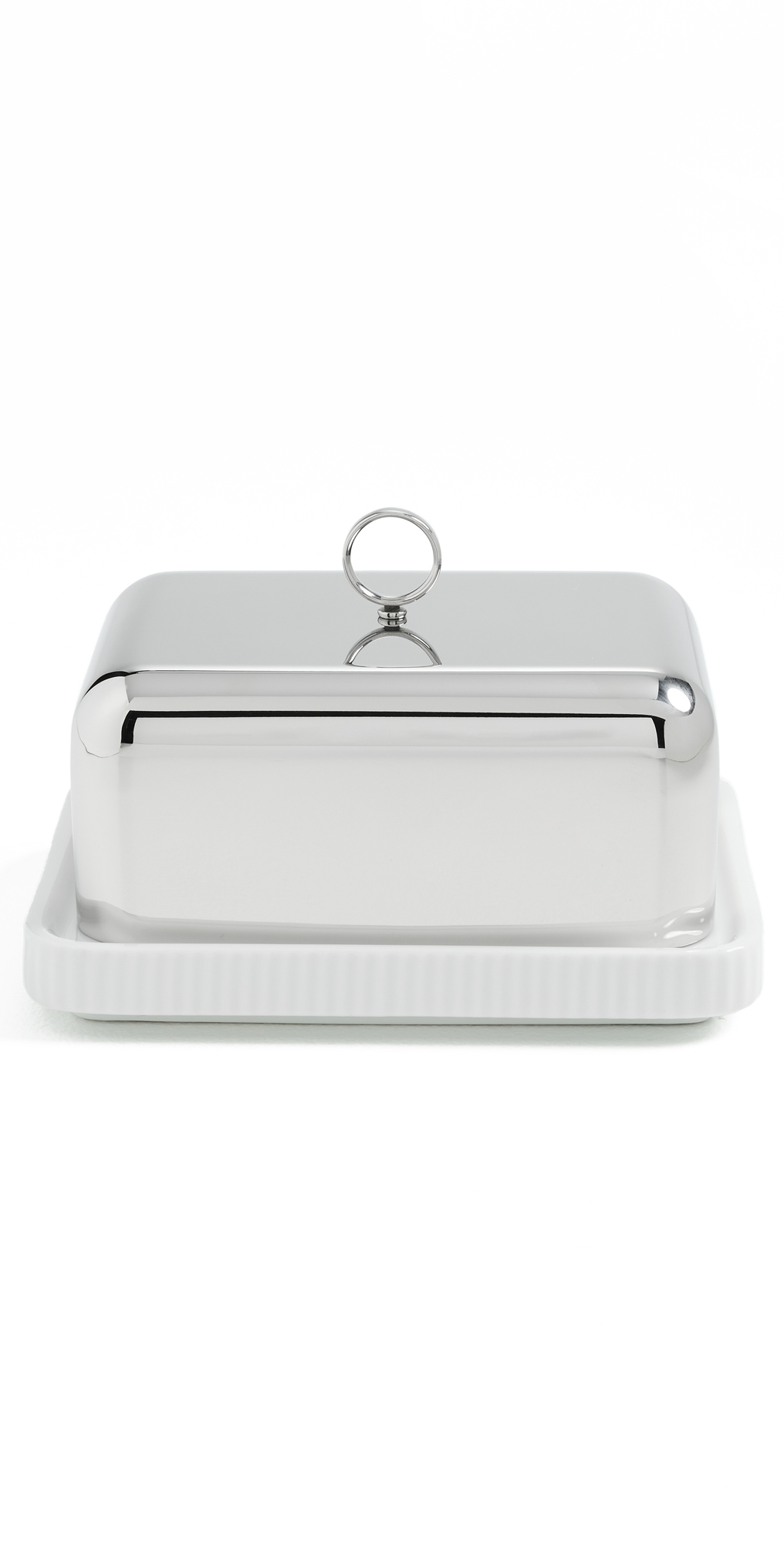 Ribbed porcelain and stainless steel. Imported, Thailand. Measurements: Height: 3.5in / 9cm Length: 5.5in / 14cm Depth: 4.25in / 11cm