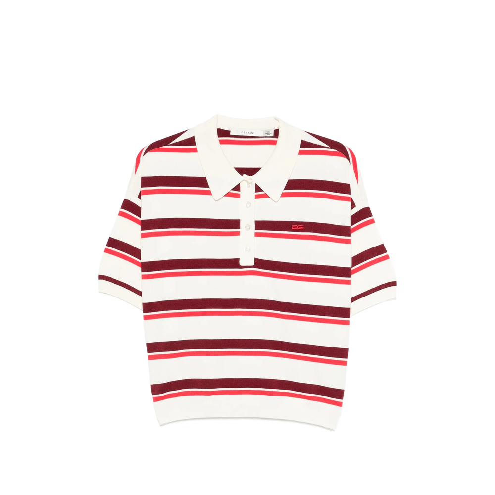 beige and multicolour stripe pattern point collar short sleeves front button fastening chest logo embroidery