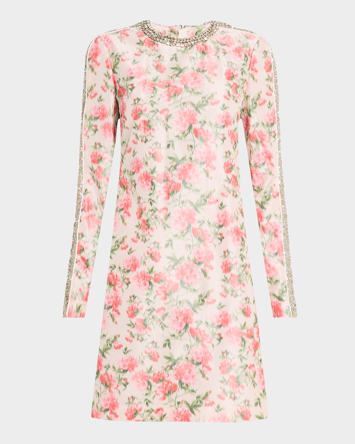 Giambattista Valli dress featuring a blurred floral motif, crystal neckline, and sequin sleeve stripes Round neckline Long sleeves; invisible zip cuffs Shift silhouette Mid thigh length Invisible back zip Silk Made in Italy