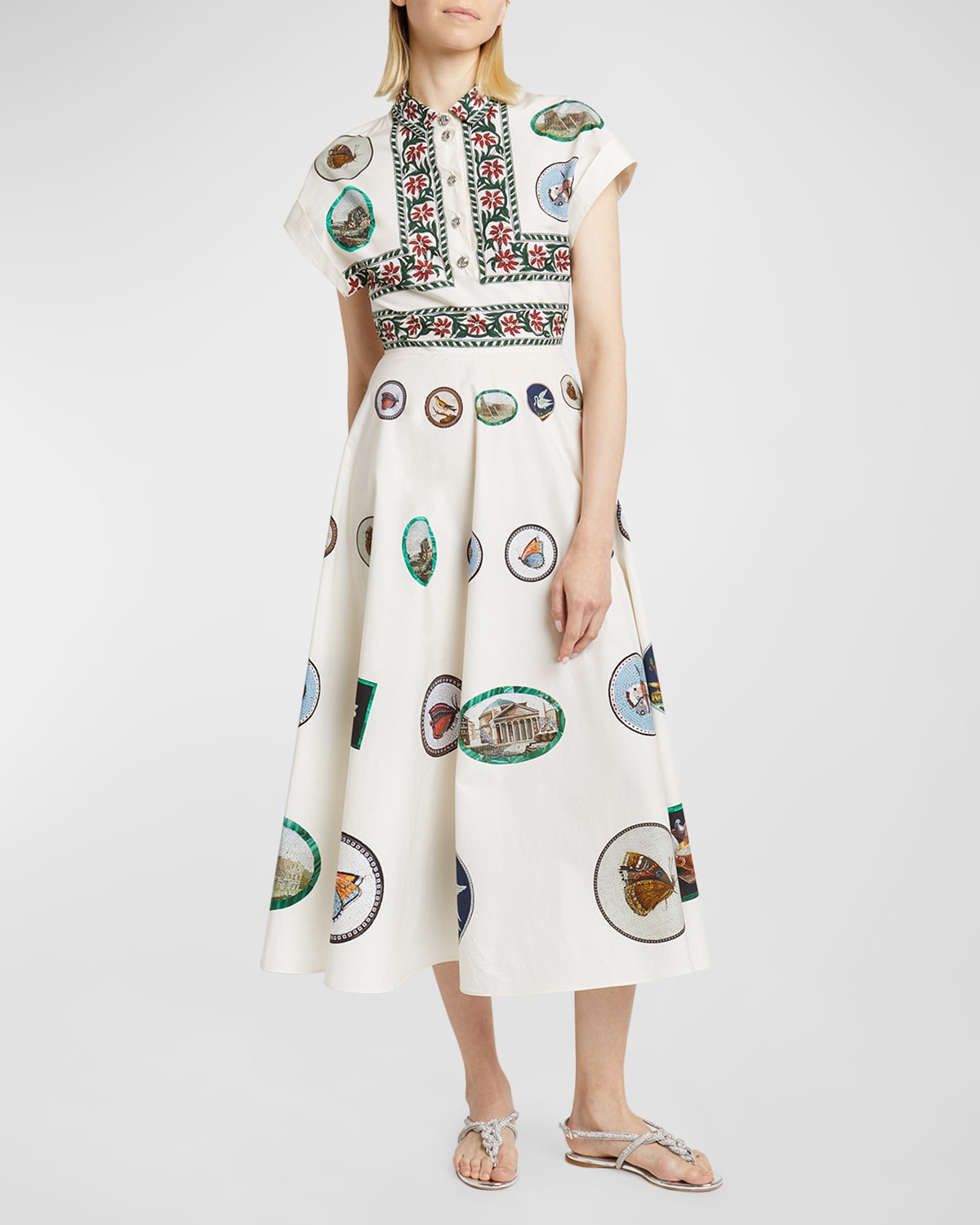 Giambattista Valli shirtdress featuring mosaic print and floral border print Point collar; fivebutton front Cap sleeves; rolled cuffs Hem falls below the knee Aline silhouette Invisible side zip Cotton Made in Romania