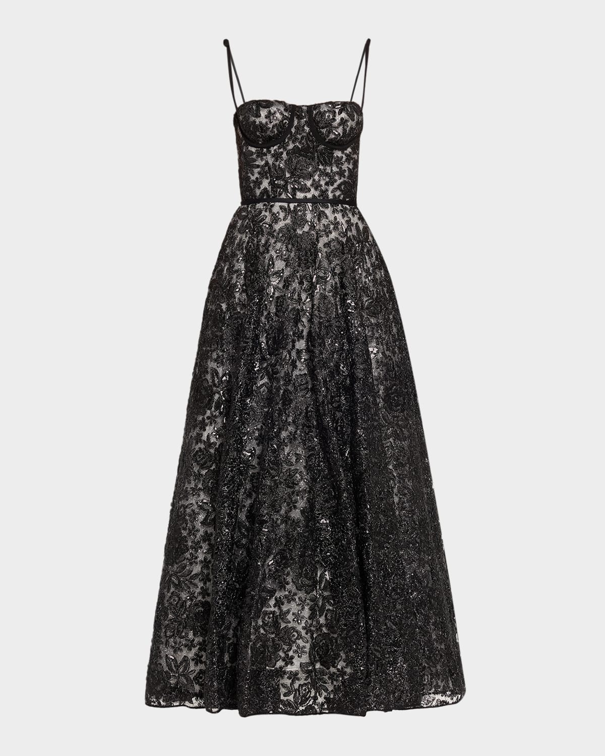 Sequined Floral Lace Bustier A-Line Maxi Dress