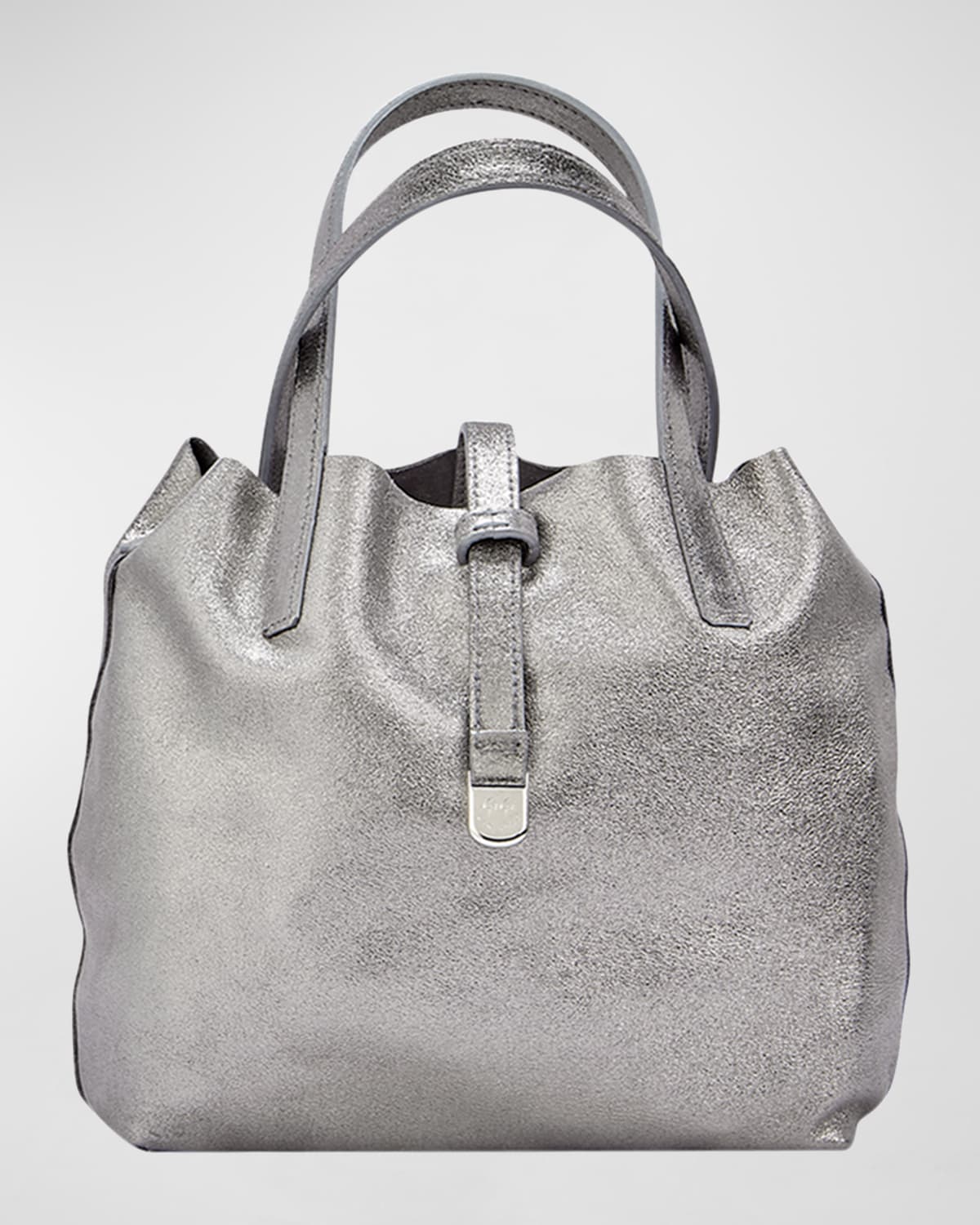 Gigi New York mini "Luna" reversible tote bag in leather and suede. Flat shoulder straps. Open top with tabover loop closure. 8"H x 11"W x 4.5"D. Made in USA of imported material.