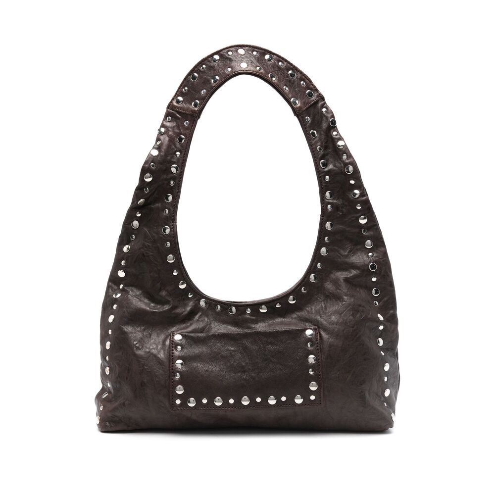 dark brown calf leather grained texture concealed magnetic fastening single shoulder strap stud embellishment slip pocket to the front logo plaque to the rear main compartment debossed internal logo internal slip pocket full lining This piece comes complete with a protective dust bag.