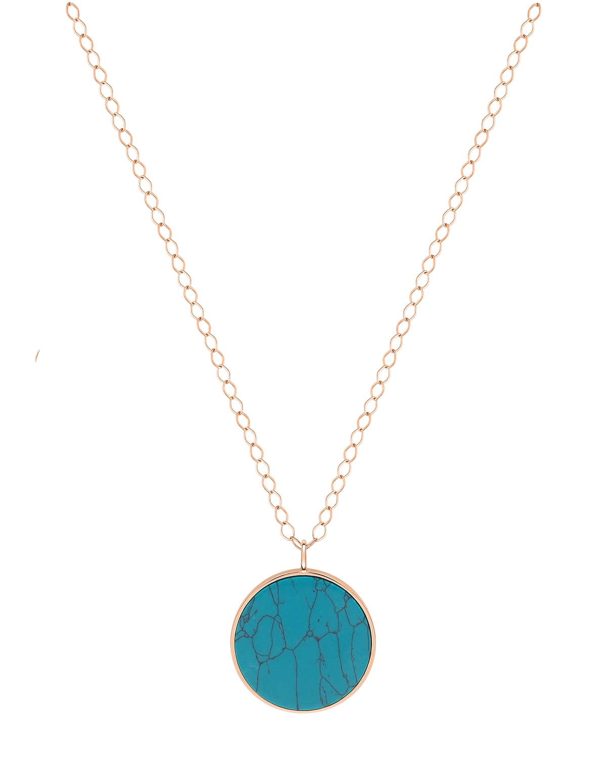 GINETTE NY necklace from the EVER Collection. Polished 18karat rose gold chain and hardware. Round pendant with turquoise inlay. Approx. 24"L; 0.7"L drop. Made in France.