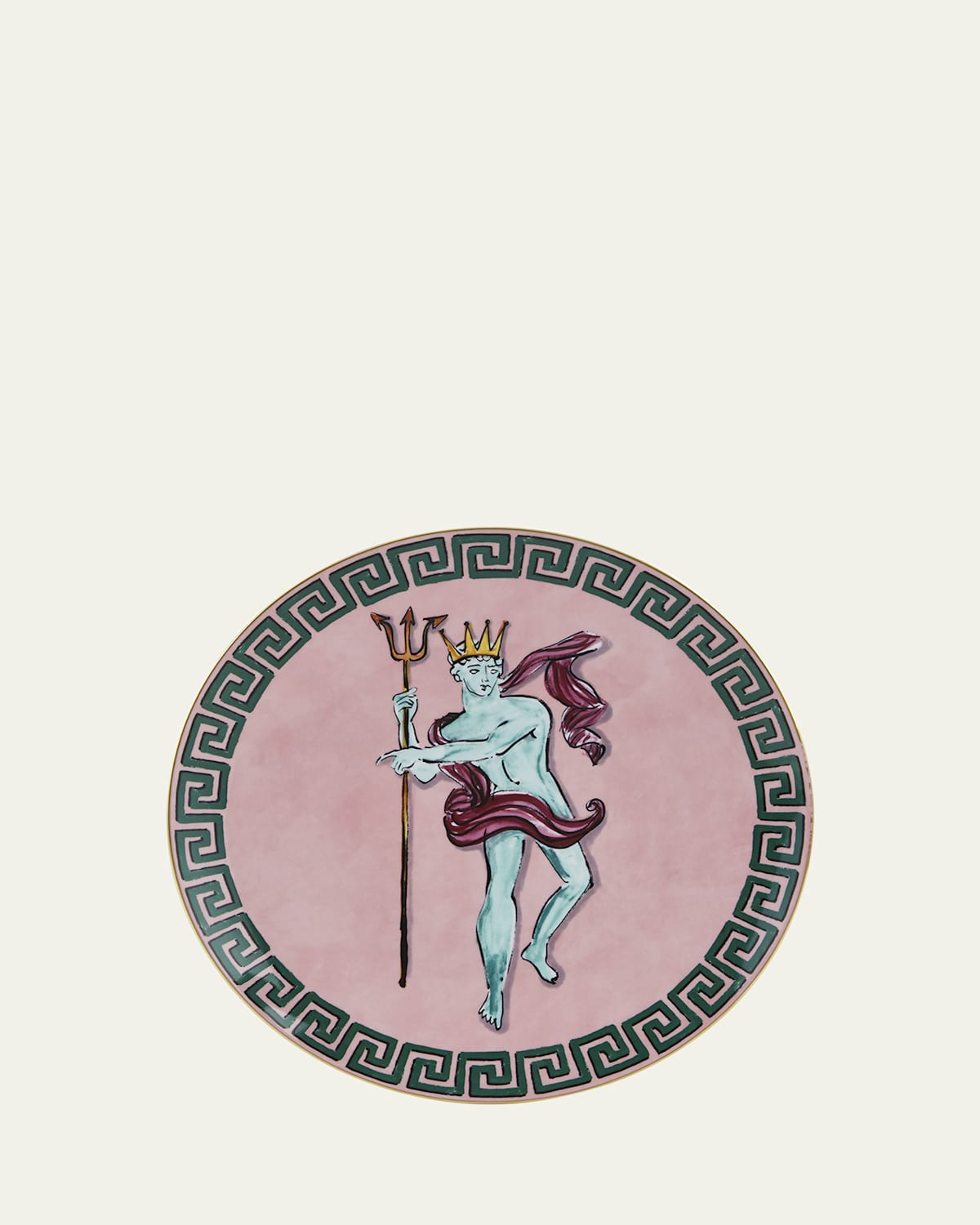 Inspired by the designer Luke Edward Hall's love of Greco Roman mythology and particularly Neptune, the Roman God of the sea, and his wife Salacia, the Il Viaggio di Nettuno collection represents an unconventional vision of the art of the table, a dialogue between classical and modern. Drawings of the gods decorate plates, placeholders, cups, vases and bold, unexpected colors infuse each item with personality. Charger is made of porcelain. Approx. 12"Dia. Dishwasher safe. Made in Italy.