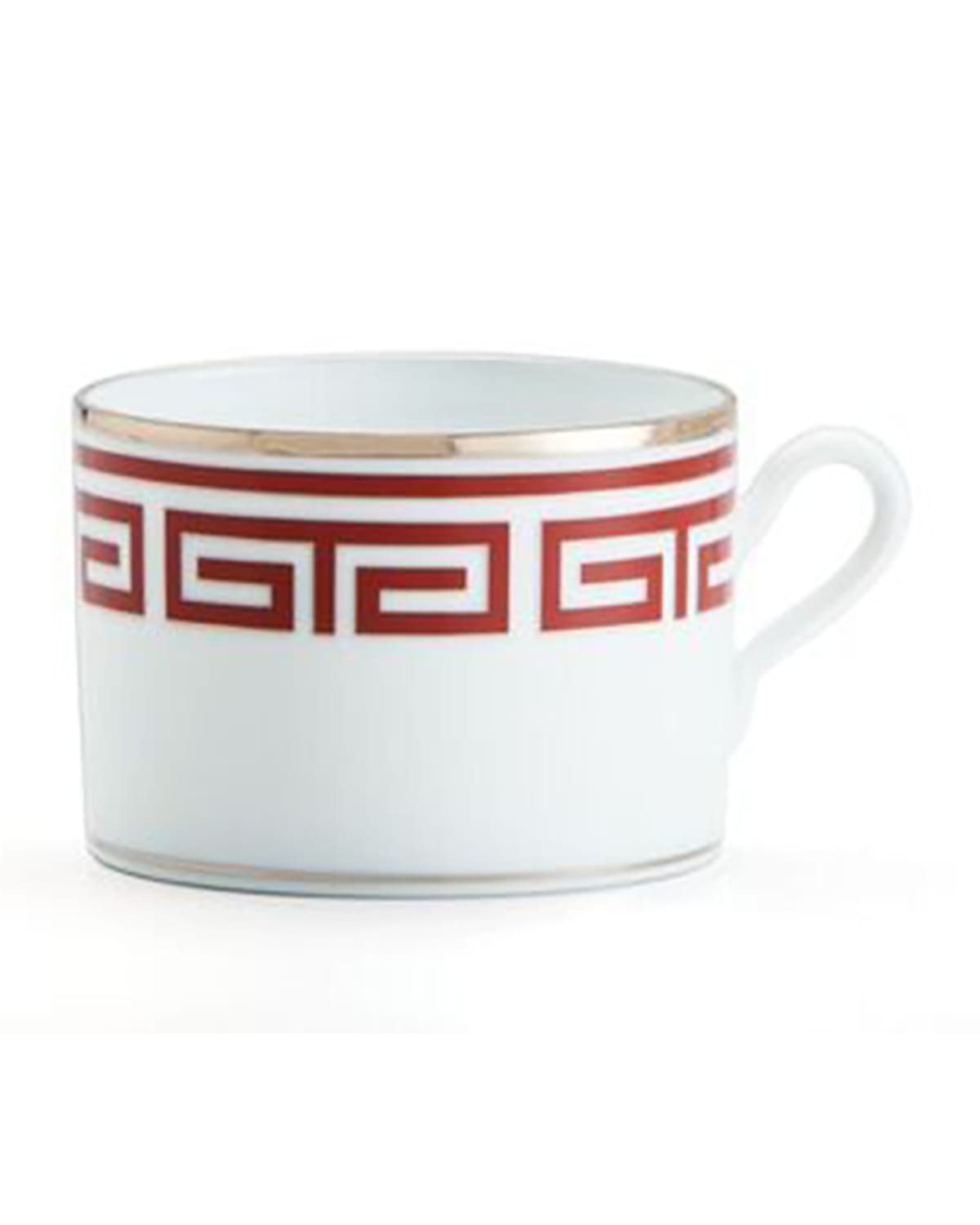 Handdetailed porcelain cup with border reminiscent of a maze. 2.75"T; holds 7.4 ounces. Hand washing recommended. Made in Italy.