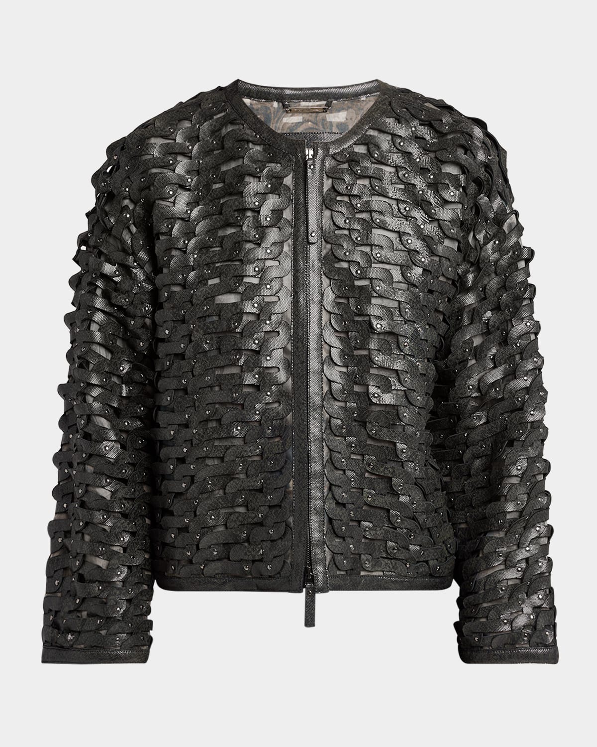Beaded Woven Snake-Embossed Leather Zip Jacket