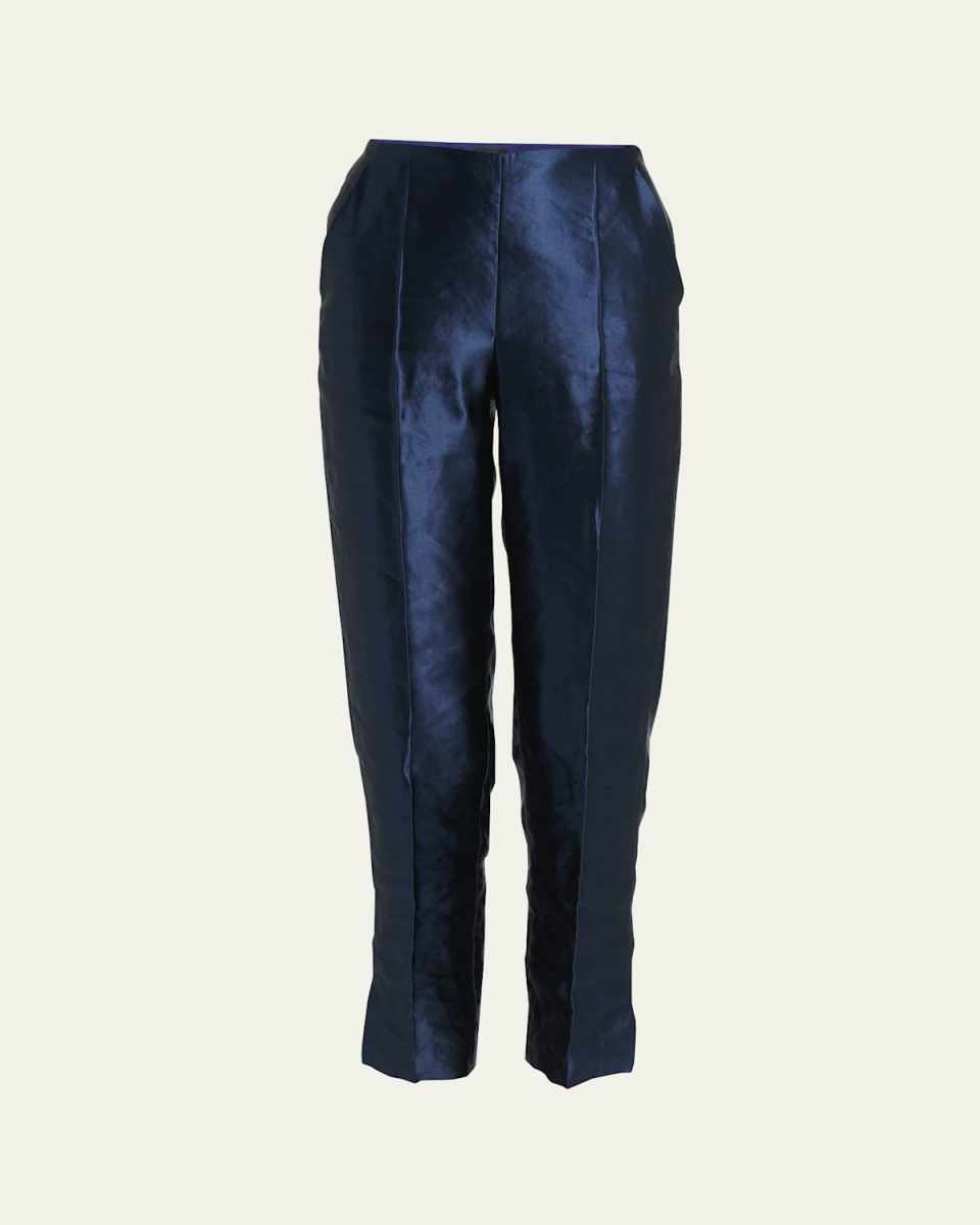 Giorgio Armani linen silk straightleg trousers in a shiny finish Midrise; sits high on hip Side slip pockets Full length Tailored fit Linen/silk Dry clean Made in Italy