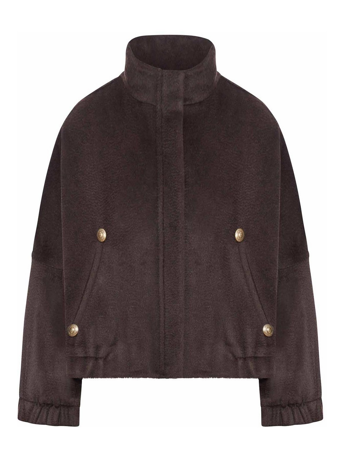 Montant, col montant, manches longues, fermeture éclair dissimulée, deux poches obliques avec boutons siglés, poignets et bas élastiqués, non doublés, marron