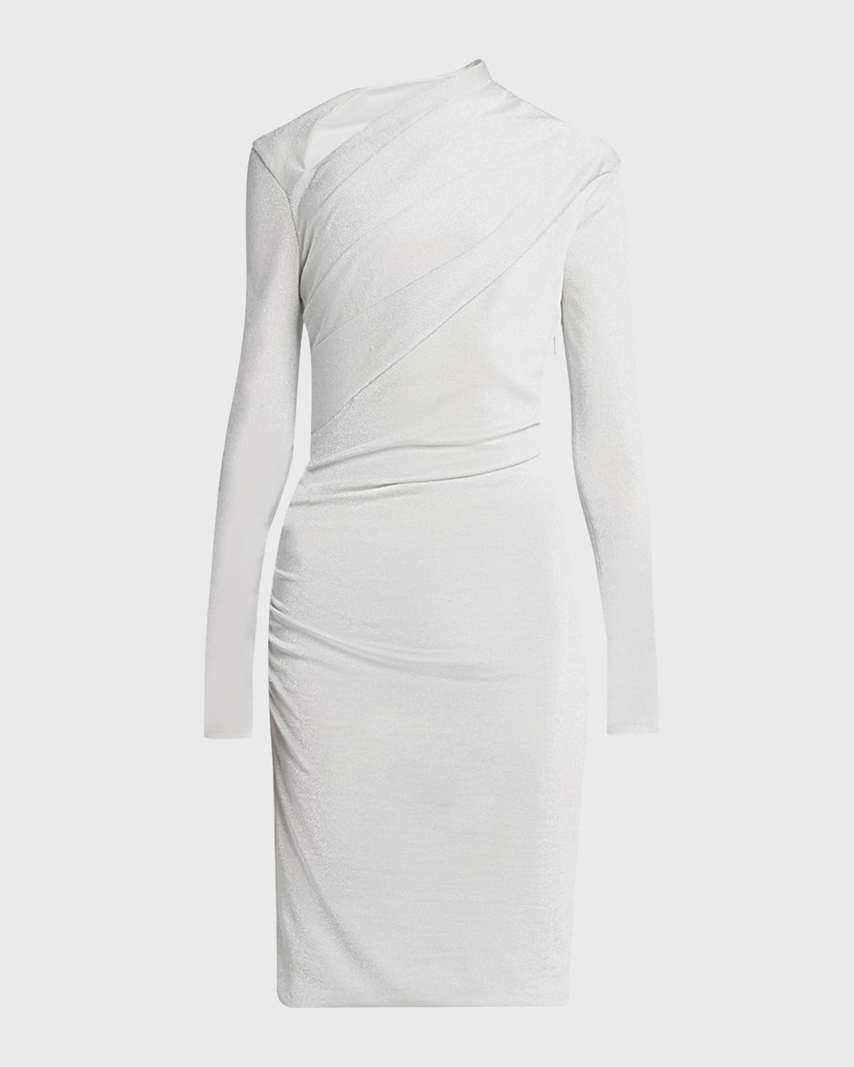 Giorgio Armani metallic jersey dress with ruched detail Asymmetric neckline Long sleeves Sheath silhouette Mini length Viscose/metallic fibers/nylon/polyamide Dry clean Made in Italy