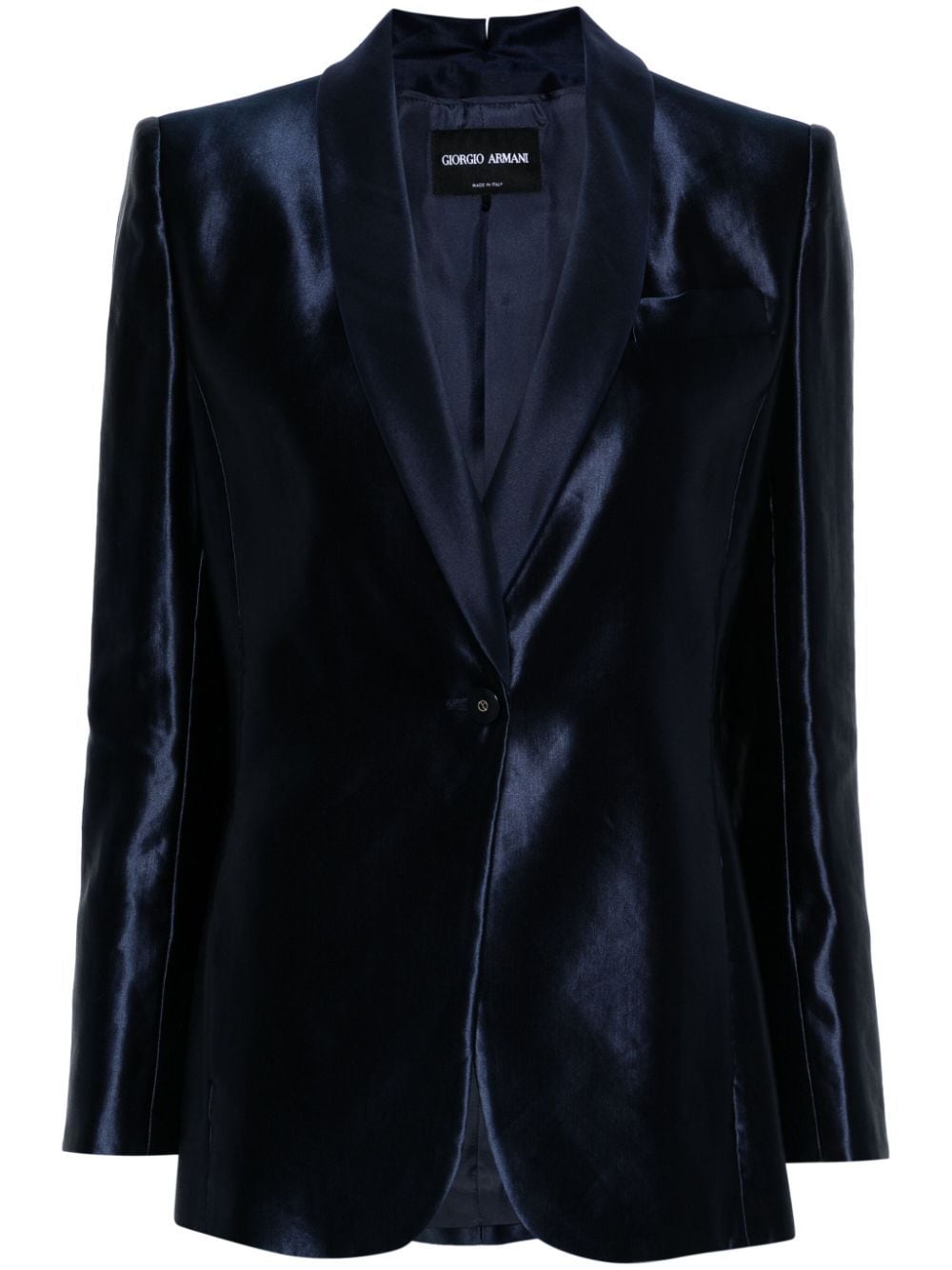 navy blue linen-silk blend satin finish shawl lapels shoulder pads long sleeves split cuffs chest welt pocket two side inset pockets English rear vents full lining front button fastening This item contains at least 50% materials which are certified or widely recognised as having a lower environmental impact through production and/or manufacturing processes that reduce water consumption and the use of harmful chemicals, or re-use by-products of the production process. Learn more about what makes a product Conscious on our Conscious Criteria page