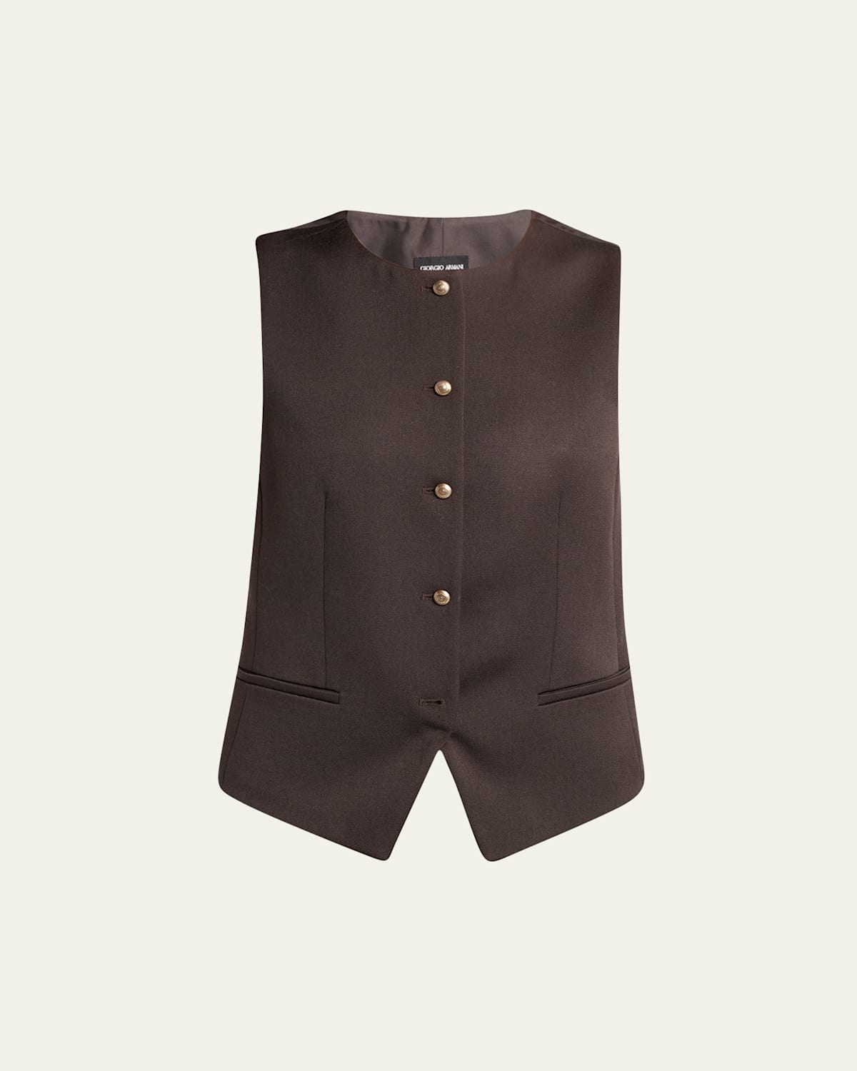 Giorgio Armani vest is tailored in wool with a satin back panel Vneckline; singlebreasted front Sleeveless Hip welt pockets Straight fit Hip length Cutaway hem Button closure Wool Dry clean Made in Italy