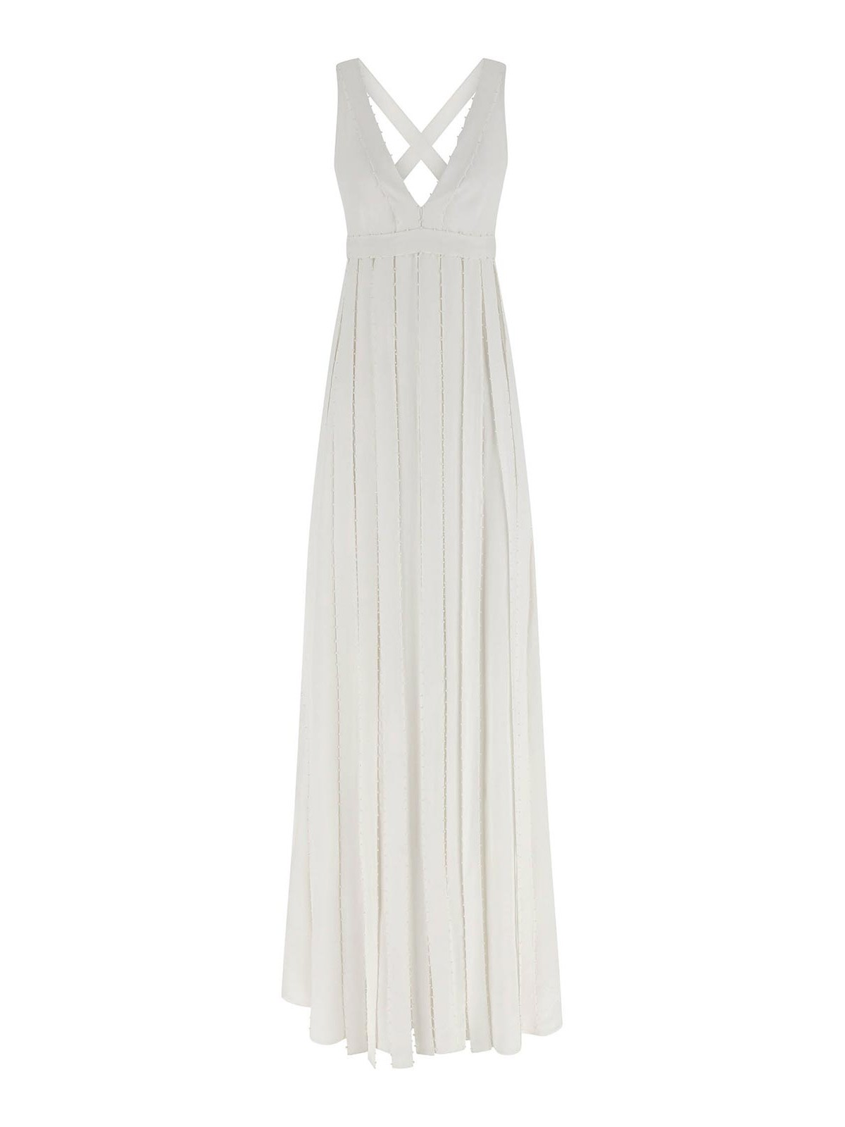 Robe longue en mélange avec mini-perles et franges appliquées, large V, col large, bretelles croisées dans le dos, jupon sans manches avec fermeture éclair latérale