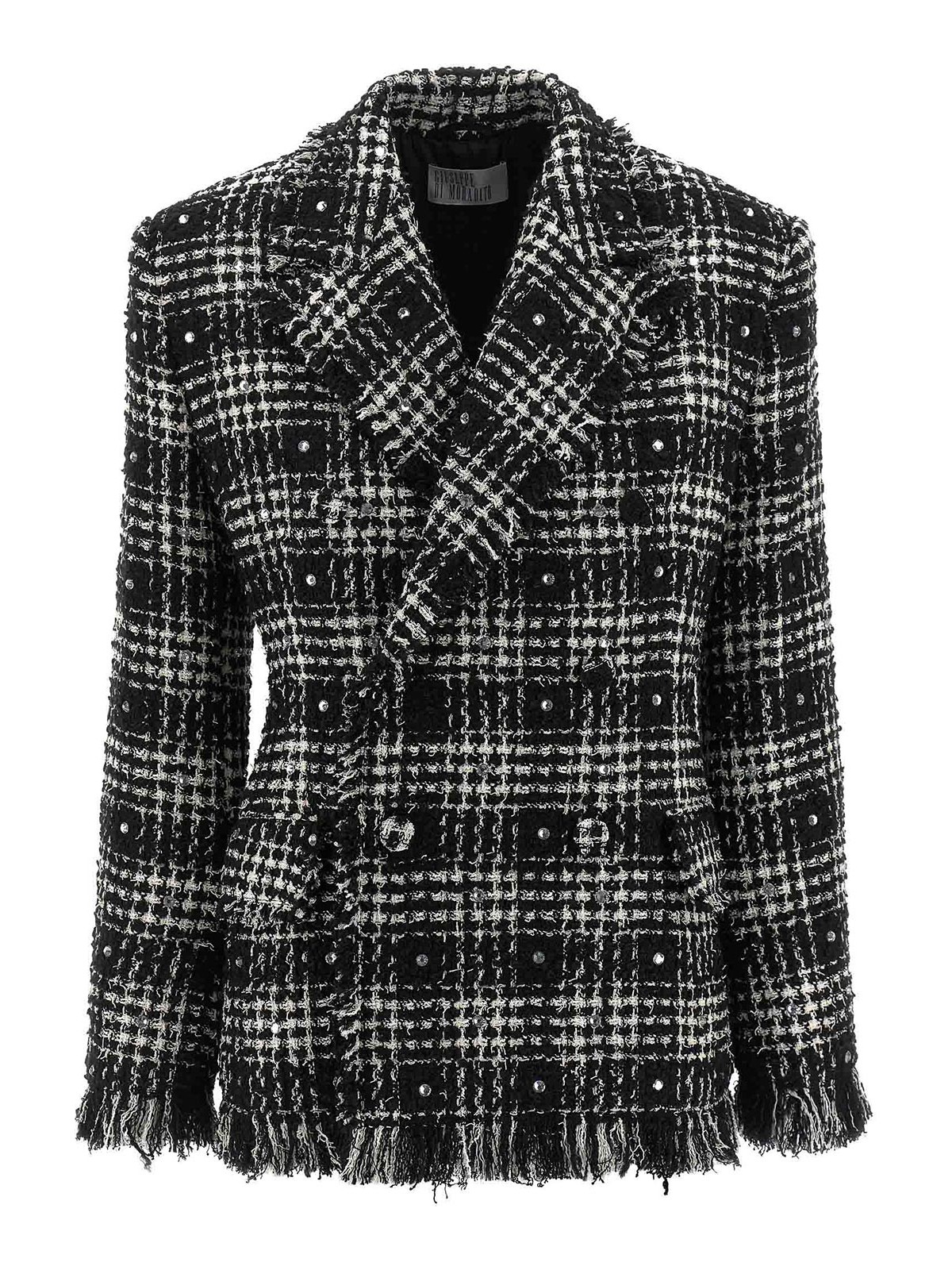 Blazer à double boutonnage en tweed mélangé avec encolure à revers en pointe, poches appliquées sur le dessus et effet effiloché sur les bords