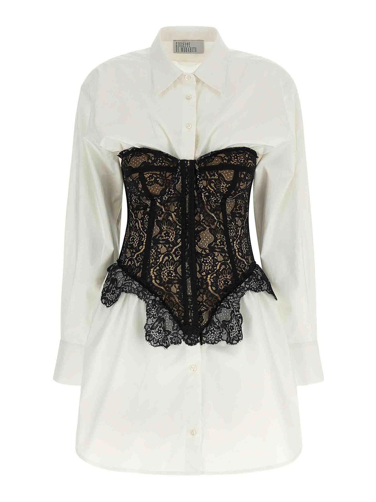 Robe en popeline de coton, style chemise avec bustier en dentelle intégrés, bouton et crochet, manches longues à revers