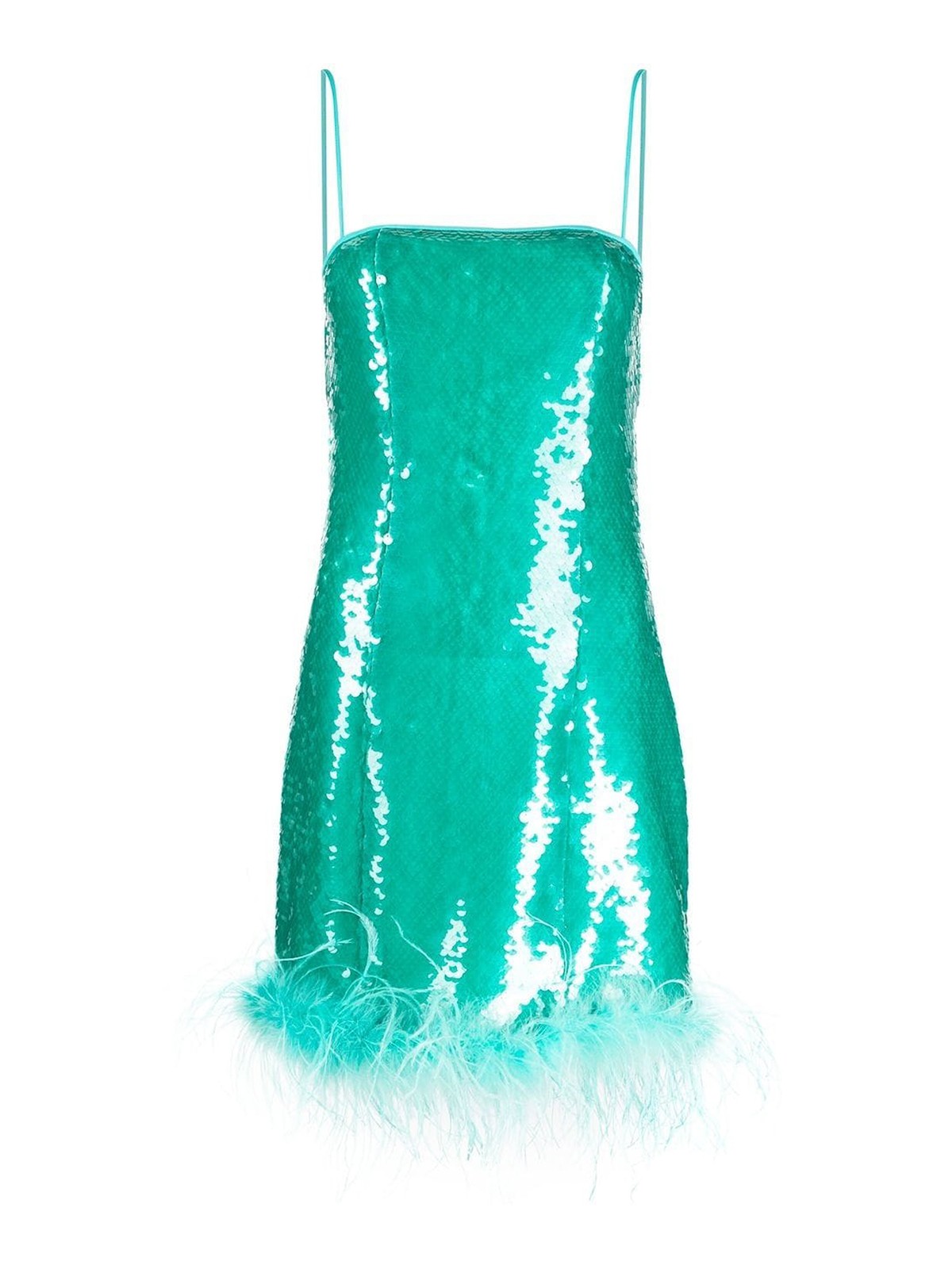 Mini-robe à paillettes ornée de plumes signée Giuseppe di Morabito, ornée de paillettes bleu aqua, de bretelles spaghetti, d'un col carré, de manches, de détails en plumes et d'une fermeture éclair arrière dissimulée.