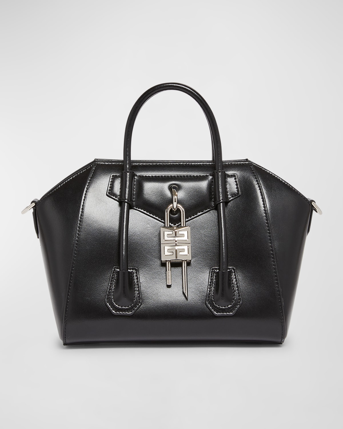 Givenchy "Antigona" top handle bag in calf leather Rolled top handles Detachable, adjustable crossbody strap Can be worn as a top handle or crossbody bag Open top with magnetic closure Exterior, oversized padlock accent Interior, one zip pocket Lining: Cotton/polyester Approx. 7.9"H x 11.4"W x 5.1"D Made in Italy