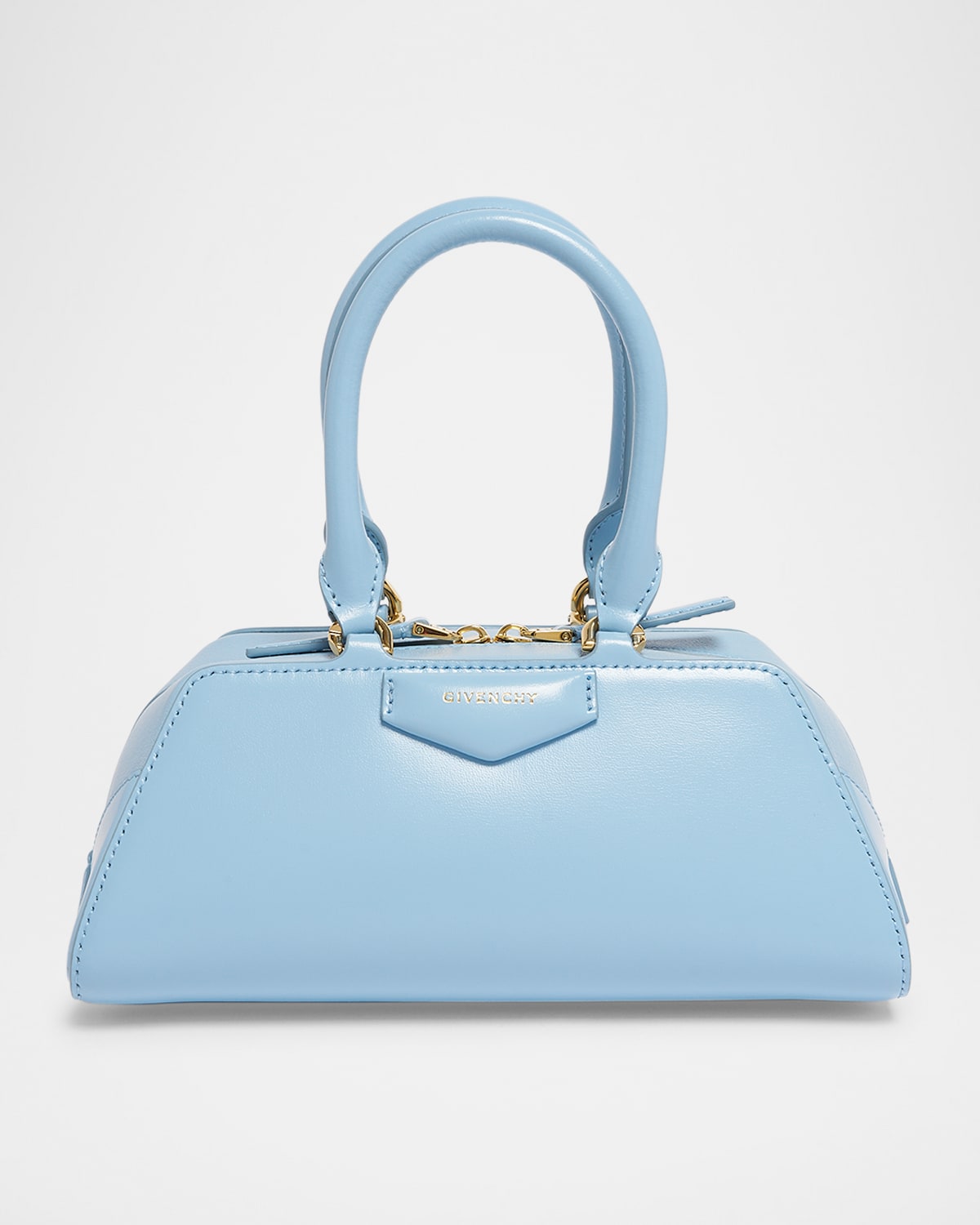 The "Antigona" tophandle bag from Givenchy features a modern, eastwest geometric design with its clean lines and fine hardware finishes Crafted in smooth and shiny box leather Rolled top handles Detachable, adjustable crossbody strap, 23.2" drop Twoway zip top Lining: Cotton Approx. 4.3"H x 9.5"W x 4.3"D Made in Italy