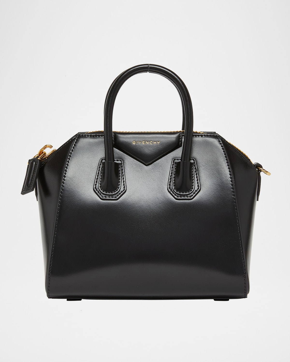 This structured Givenchy "Antigona" tote bag is crafted in box leather; the smooth finish and angular lines play with the light for a slight sheen Rolled top handles Detachable, adjustable shoulder strap Can be worn as a top handle or shoulder bag Zip top closure Interior, one zip pocket Feet protect the bottom of the bag Lining: Cotton Approx. 7.5"H x 10.2"L x 5.1"W Made in Italy