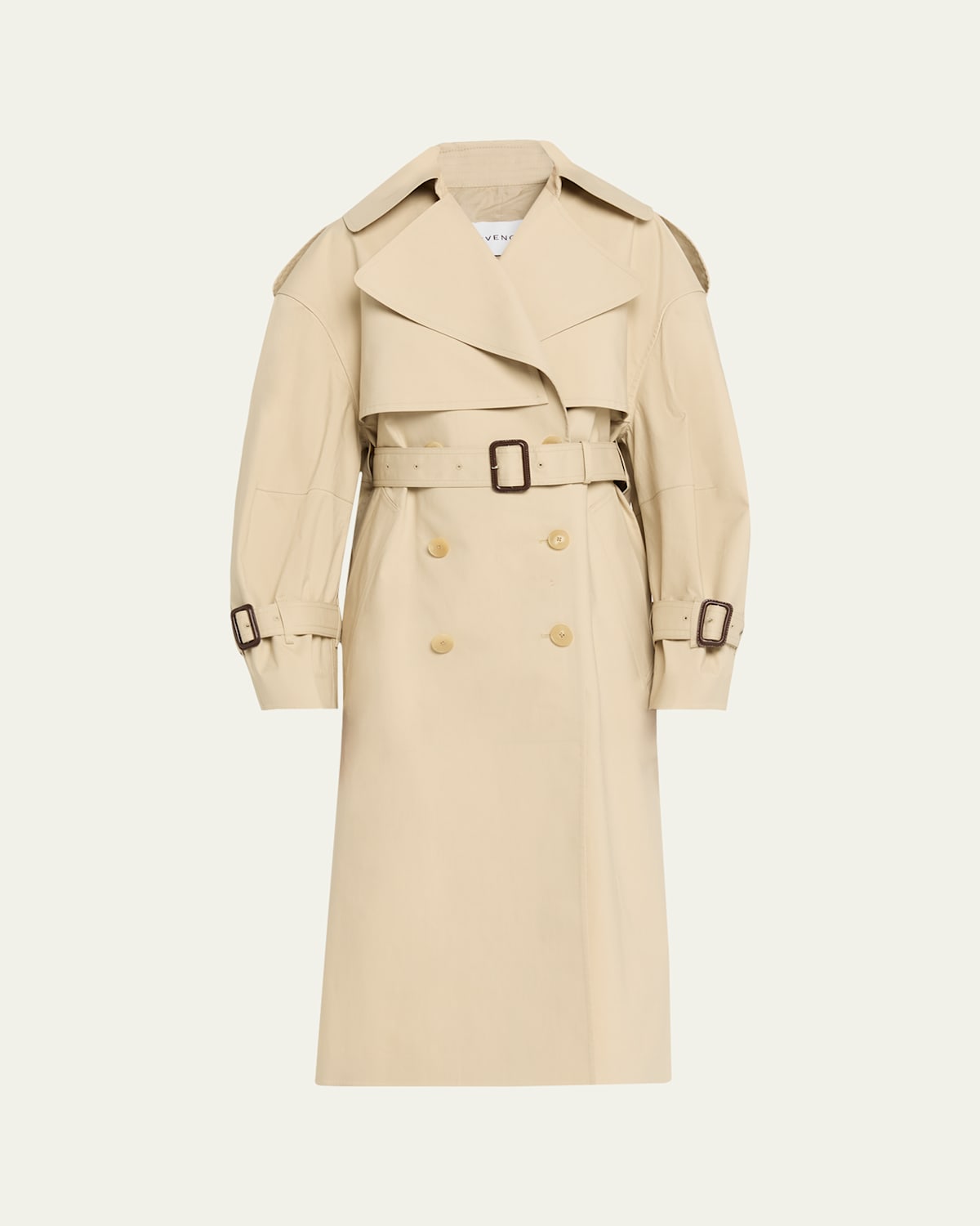 Classic tailoring meets sculptural silhouettes with this Givenchy cocoon trench coat featuring a cocoonlike blouson back cinched with a belted waist Trench collar with throat latch; doublebreasted front Long sleeves; belted cuffs Shoulder epaulets Chest gun flaps; rain shield back Belted waist Hip welt pockets Oversized fit Hem falls below the knee Side slits Cotton Made in Portugal