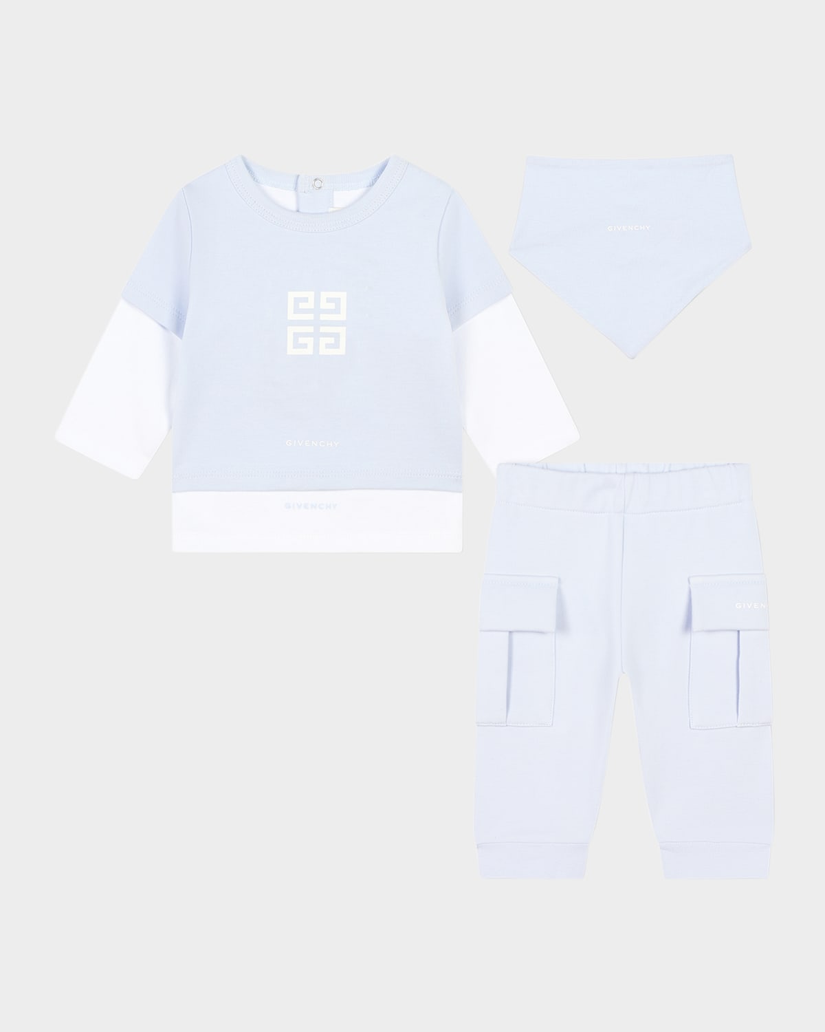Givenchy threepiece set features classic logo emblem at front Round neckline Long sleeves Snap closures at back Elasticized waistband Side flap pockets Banded hems Comes with matching bandana bib Cotton Made in Portugal