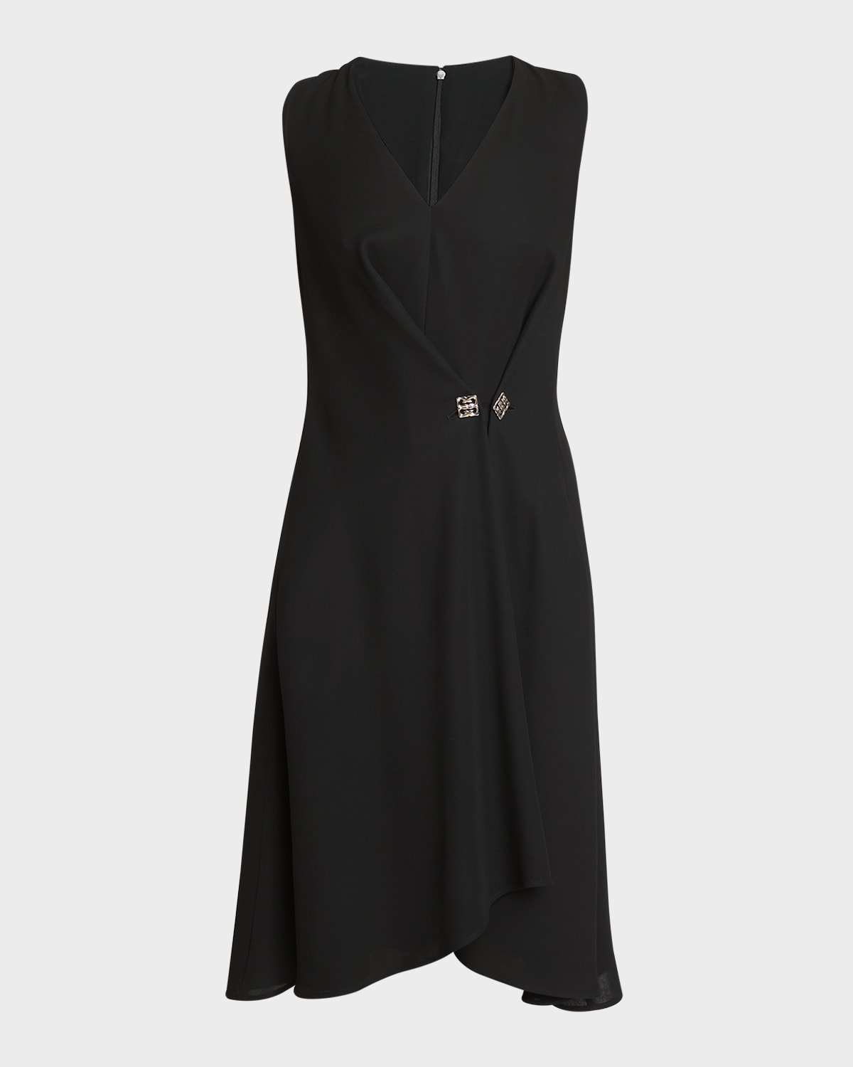Givenchy dress features 4G metal buttons that cinch in the waist V neckline Sleeveless Nipped waist Hem falls below the knee Aline silhouette Invisible back zip closure Viscose Made in Italy