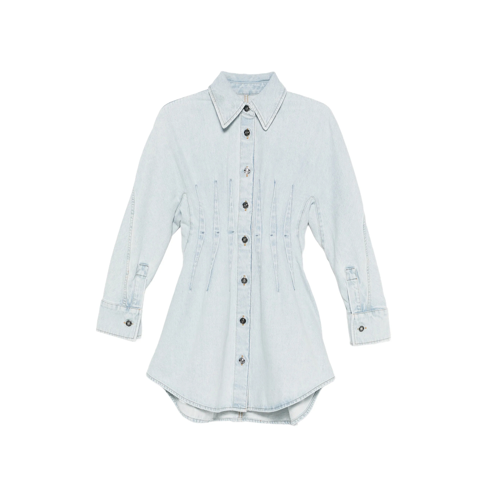 light blue button fastening pointed collar long sleeves curved hem
