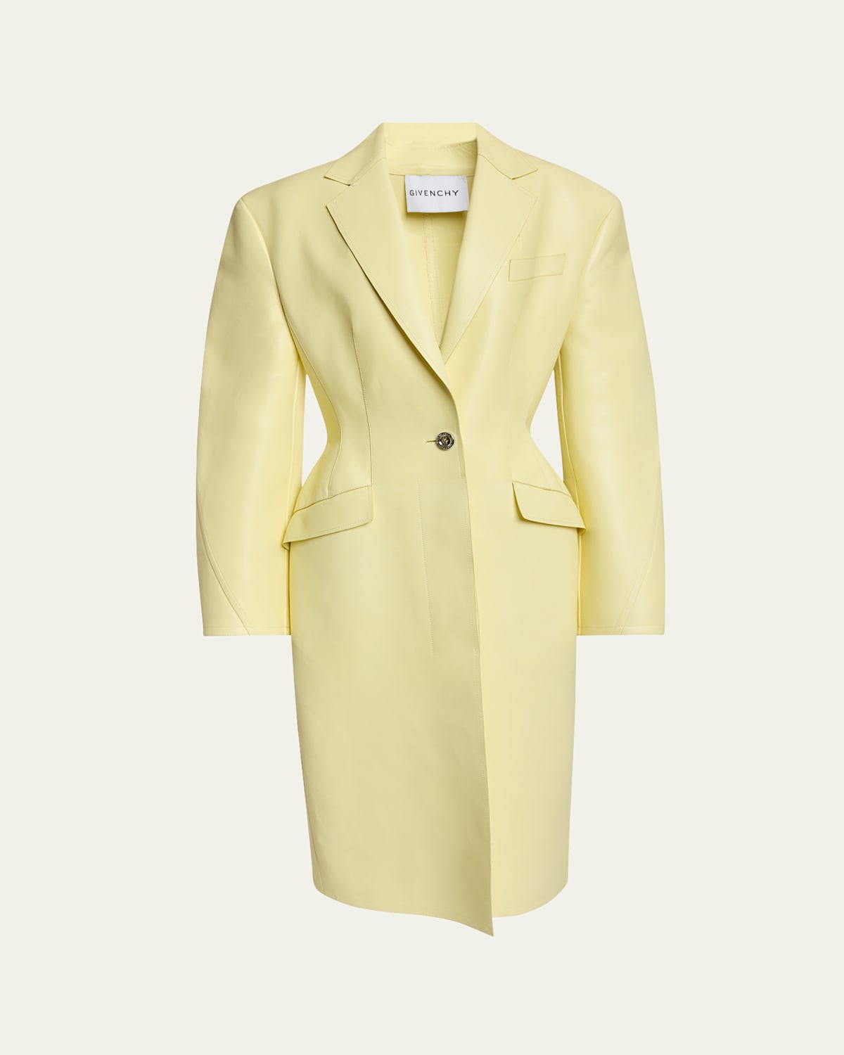 Elevated with a tailored cocoonshaped silhouette, this coat by Givenchy is crafted from smooth leather Notched lapels; singlebutton front Padded shoulders Long sleeves Hip flap pockets Centercut back vent Hem falls below the knee Leather/polyester Made in Italy