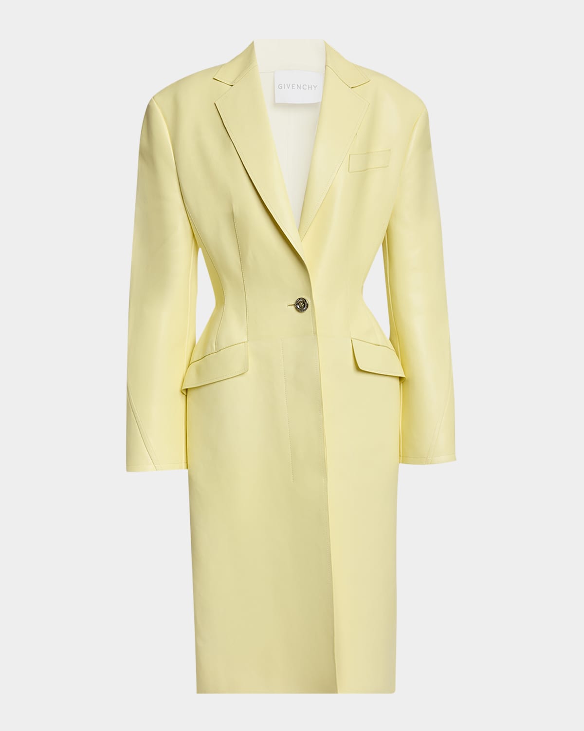 Elevated with a tailored cocoonshaped silhouette, this coat by Givenchy is crafted from smooth leather Notched lapels; singlebutton front Padded shoulders Long sleeves Hip flap pockets Centercut back vent Hem falls below the knee Leather/polyester Made in Italy