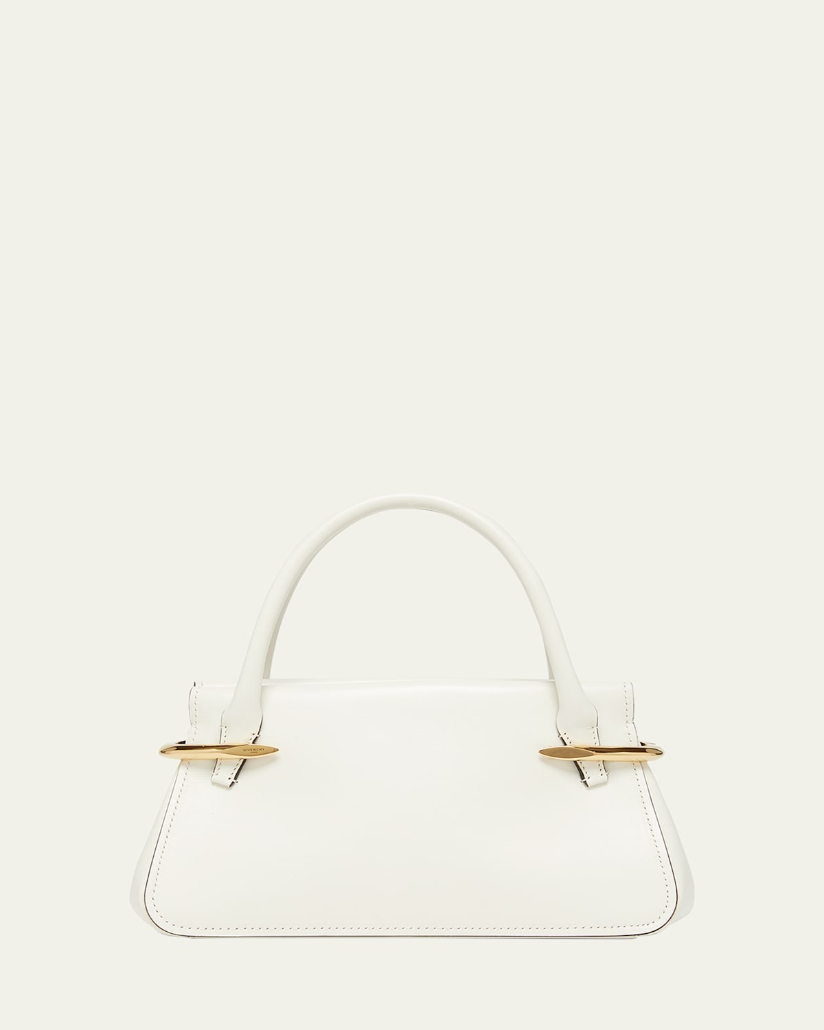 The "Pinch" shoulder bag by Givenchy is crafted in smooth leather with curved logoengraved metallic bar accents Rolled top handles Detachable shoulder strap Can be worn as a top handle or shoulder bag Open top Interior, one slip pocket Lining: Leather Approx. 4.7"H x 9.1"W x 3.9"D Made in Italy
