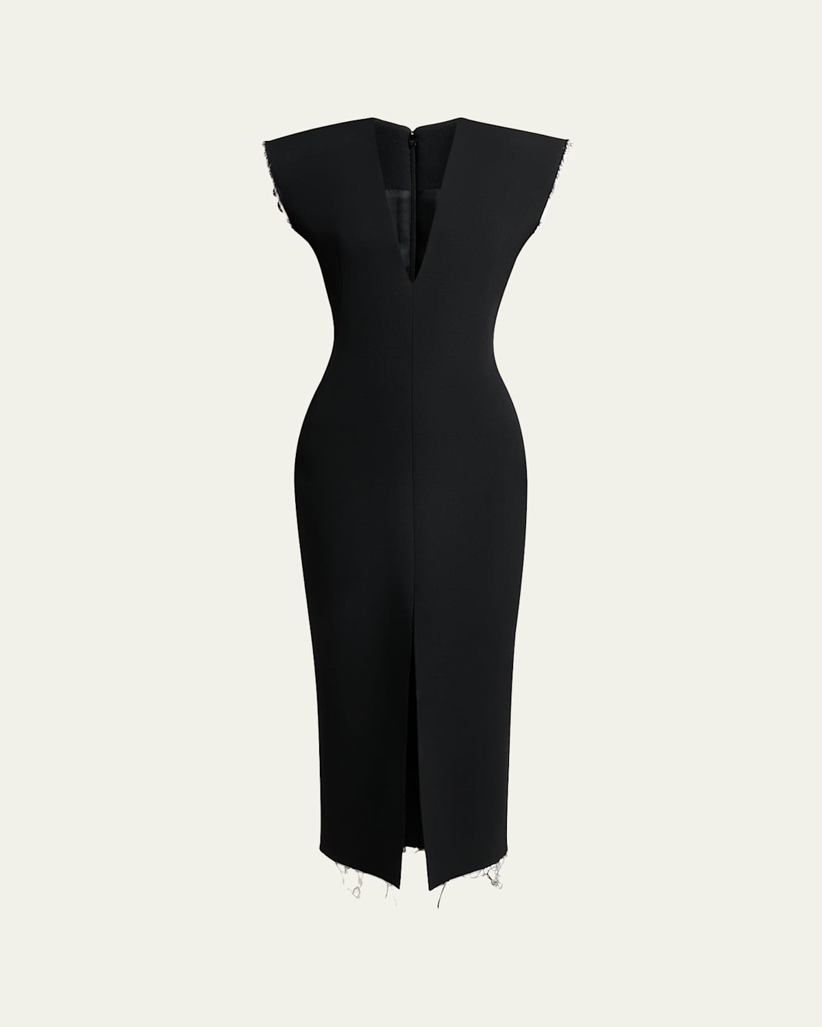 Givenchy dress redefines classic tailoring with sculptural lines and undone raw edge detailing Plunging neckline Sleeveless Padded shoulders Sheath silhouette Hem falls below the knee Centerfront and back slits Back zip Wool/nylon/polyamide/elastane Made in Italy