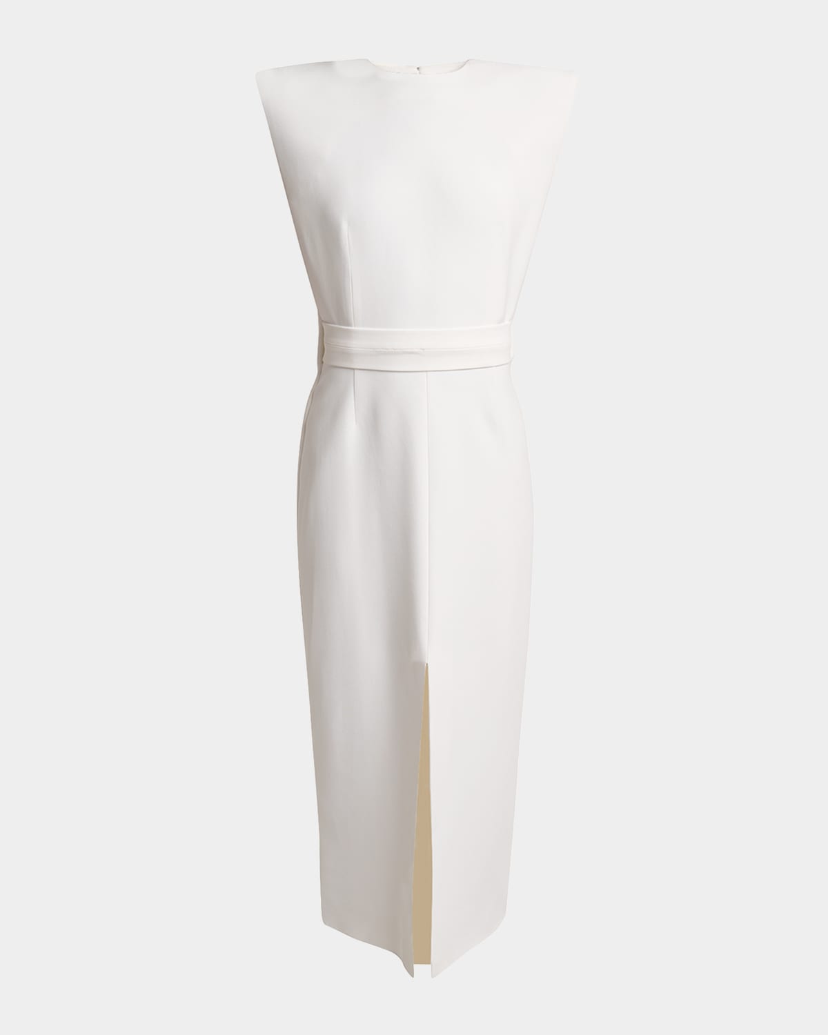 Modern minimalism meets dramatic movement in this Givenchy midi dress, designed with a sleek silhouette, waistdefining band, and a fluid capeback detail. Round neckline Sleeveless Padded shoulders Sheath silhouette Hem falls below the knee Centerfront slit hem Back zip Viscose/acetate/elastane Made in Italy