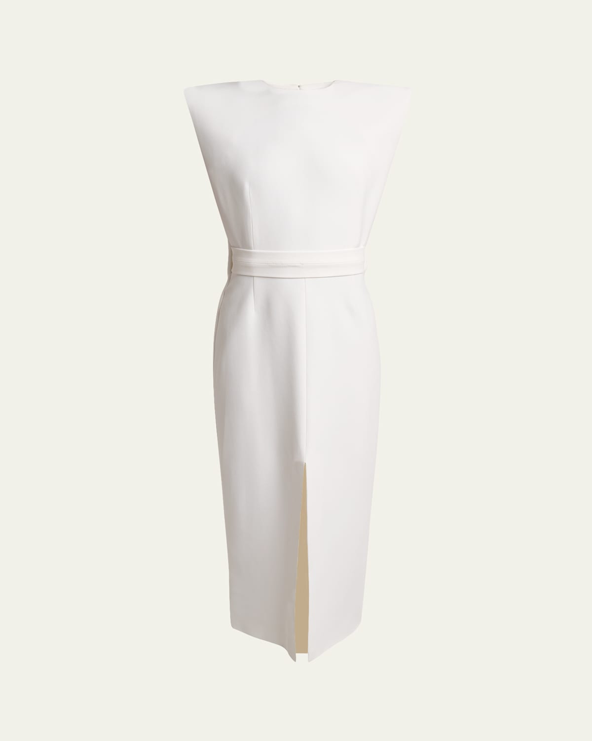 Modern minimalism meets dramatic movement in this Givenchy midi dress, designed with a sleek silhouette, waistdefining band, and a fluid capeback detail. Round neckline Sleeveless Padded shoulders Sheath silhouette Hem falls below the knee Centerfront slit hem Back zip Viscose/acetate/elastane Made in Italy