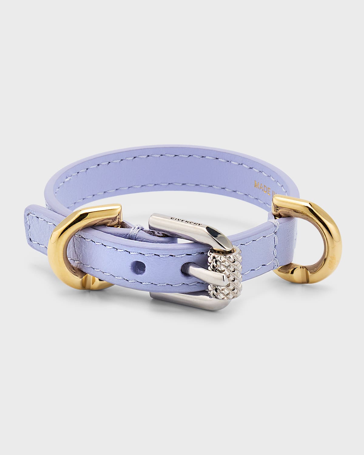 Givenchy bracelet from the Voyou collection Calfskin leather, brass and stainless steel Shiny goldtone and silvertone hardware Thorn buckle with engraved logo text Adjustable length Made in Italy
